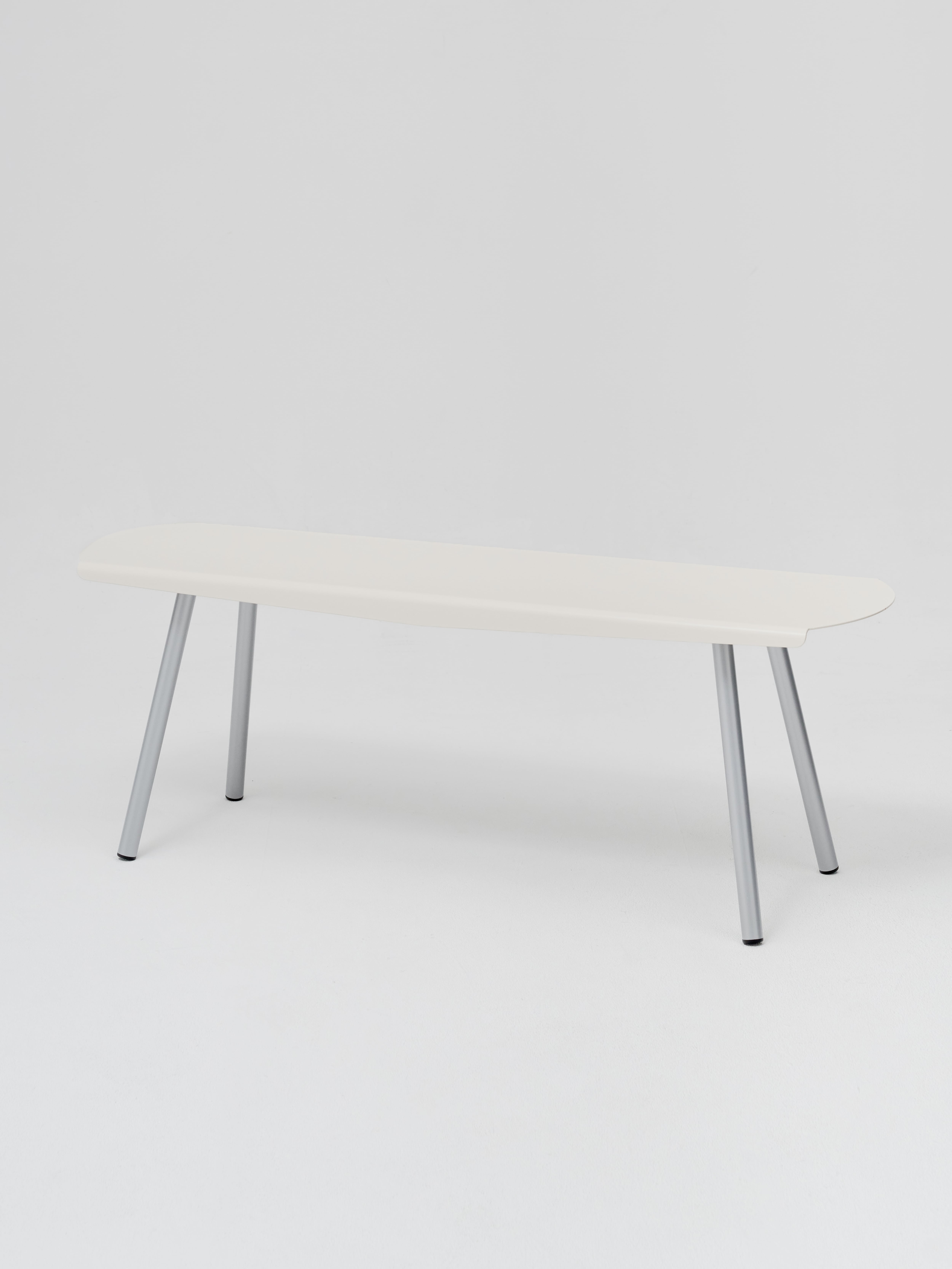 厚みわずか3㎜のアルミニウム板の軽さと柔軟性を活かしつつ、板金特有の鋭さではなく、柔らかな曲線美を採用しています。金属が持つ冷たい印象を払拭し、温かみのある佇まいを目指すことで、素材と技術の融合による新たな家具のあり方を提案しています。