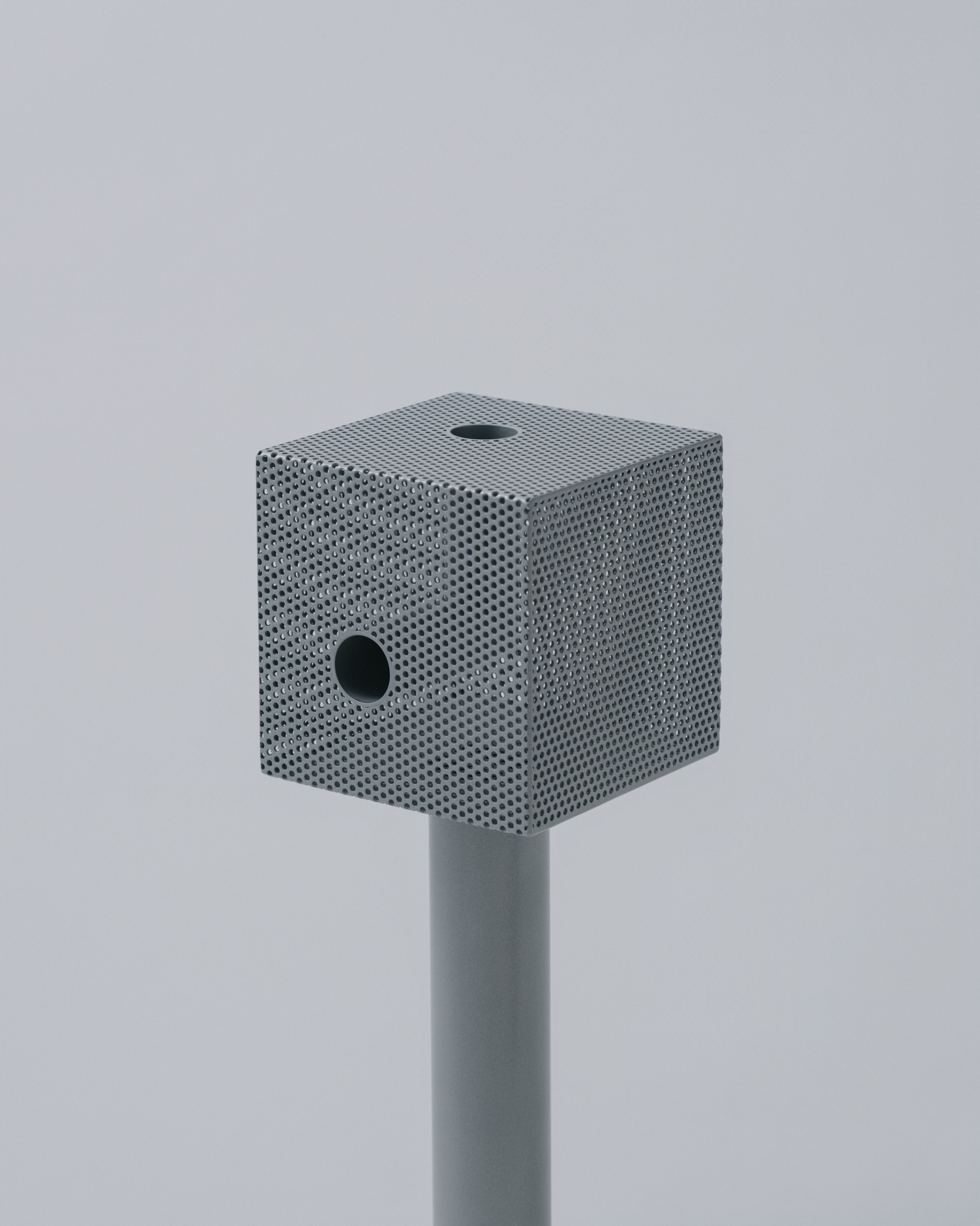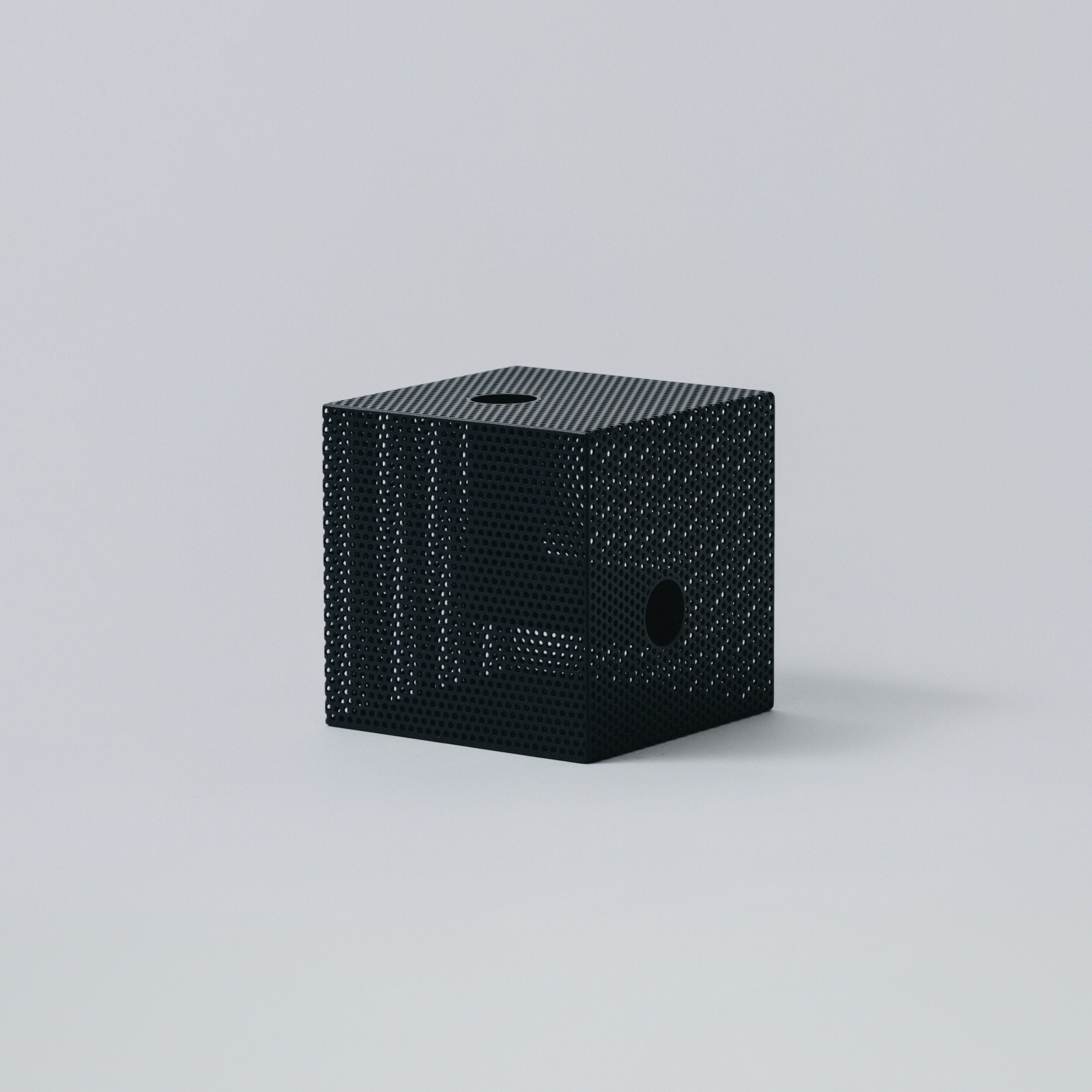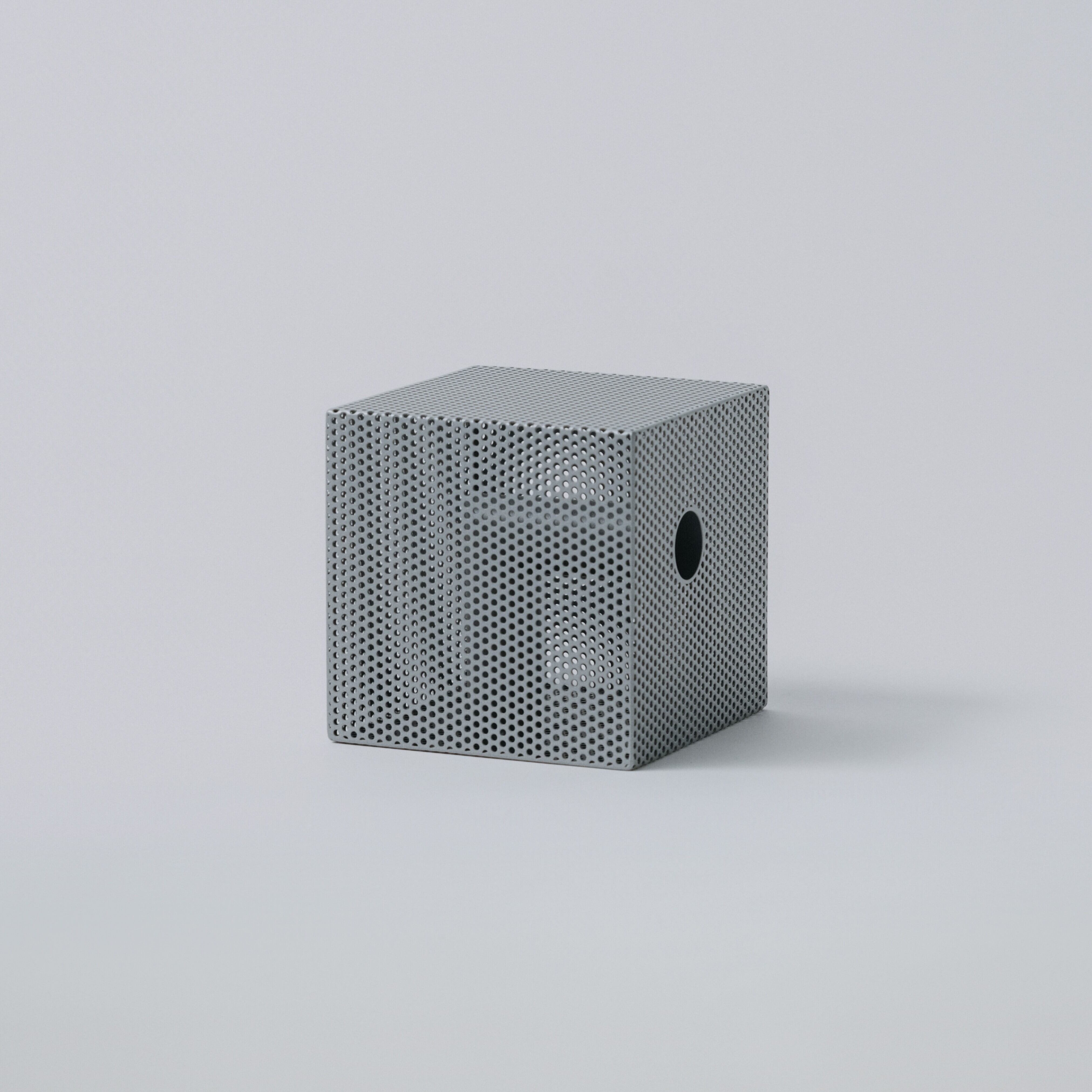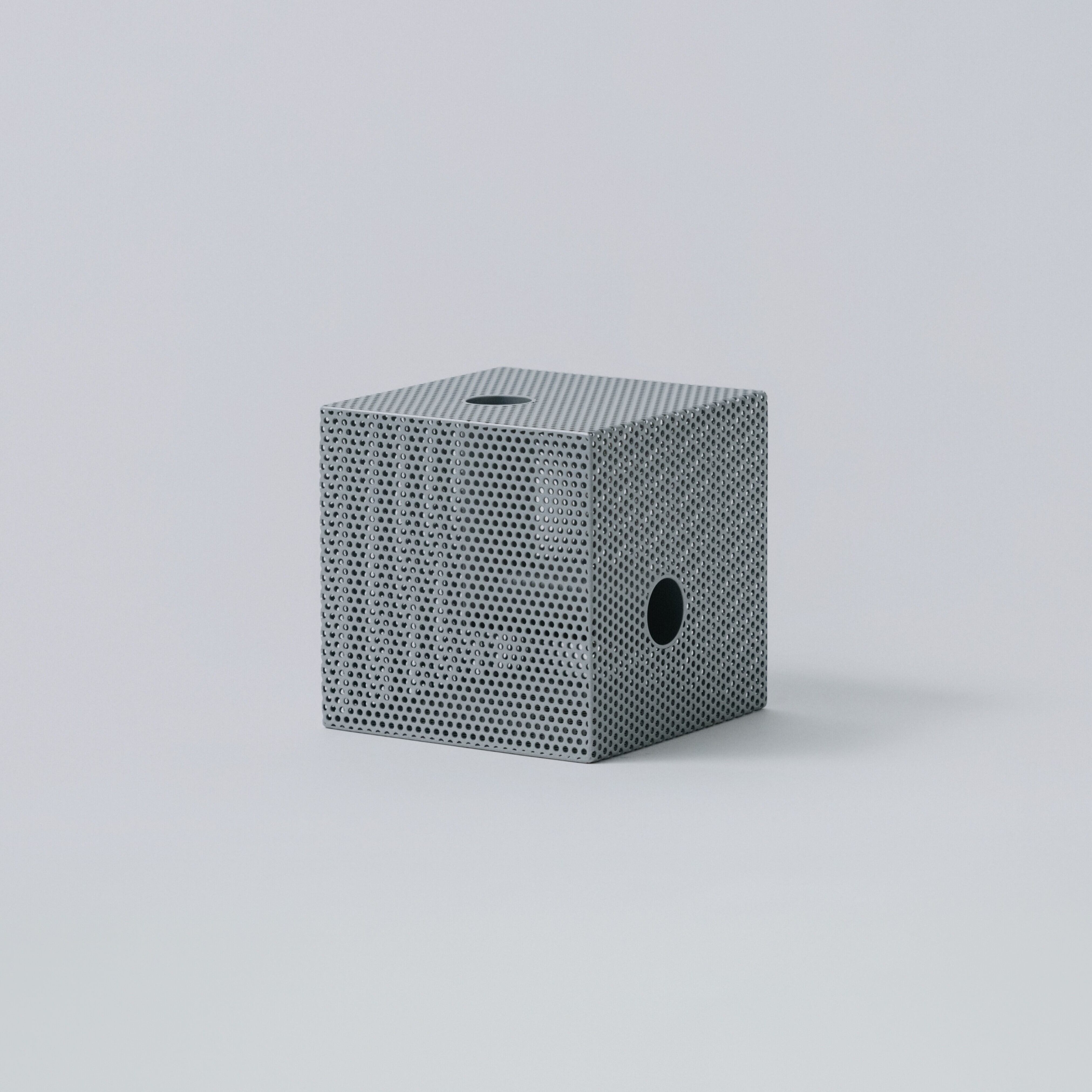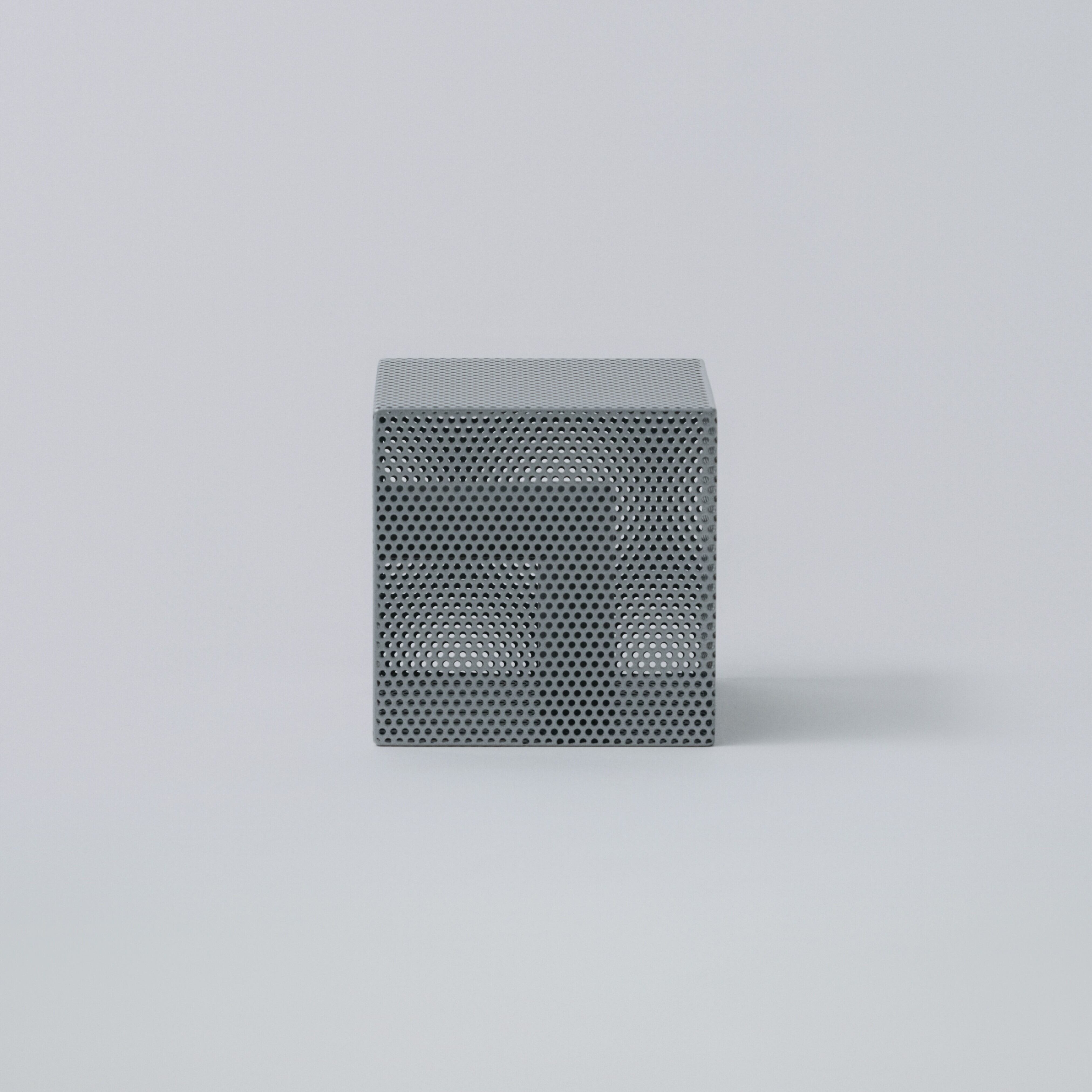 パンチングメタルは、建築・家具・工業製品などで、軽量化・通気性・強度といった機能性を目的に発展してきた素材。しかし、“透けているのに覆っている”、“閉じているようで抜けている” という曖昧な存在感を持ち、光や視点によって印象が大きく変わります。Punching Block は、この“見え方の揺らぎ”そのものに焦点を当てています。