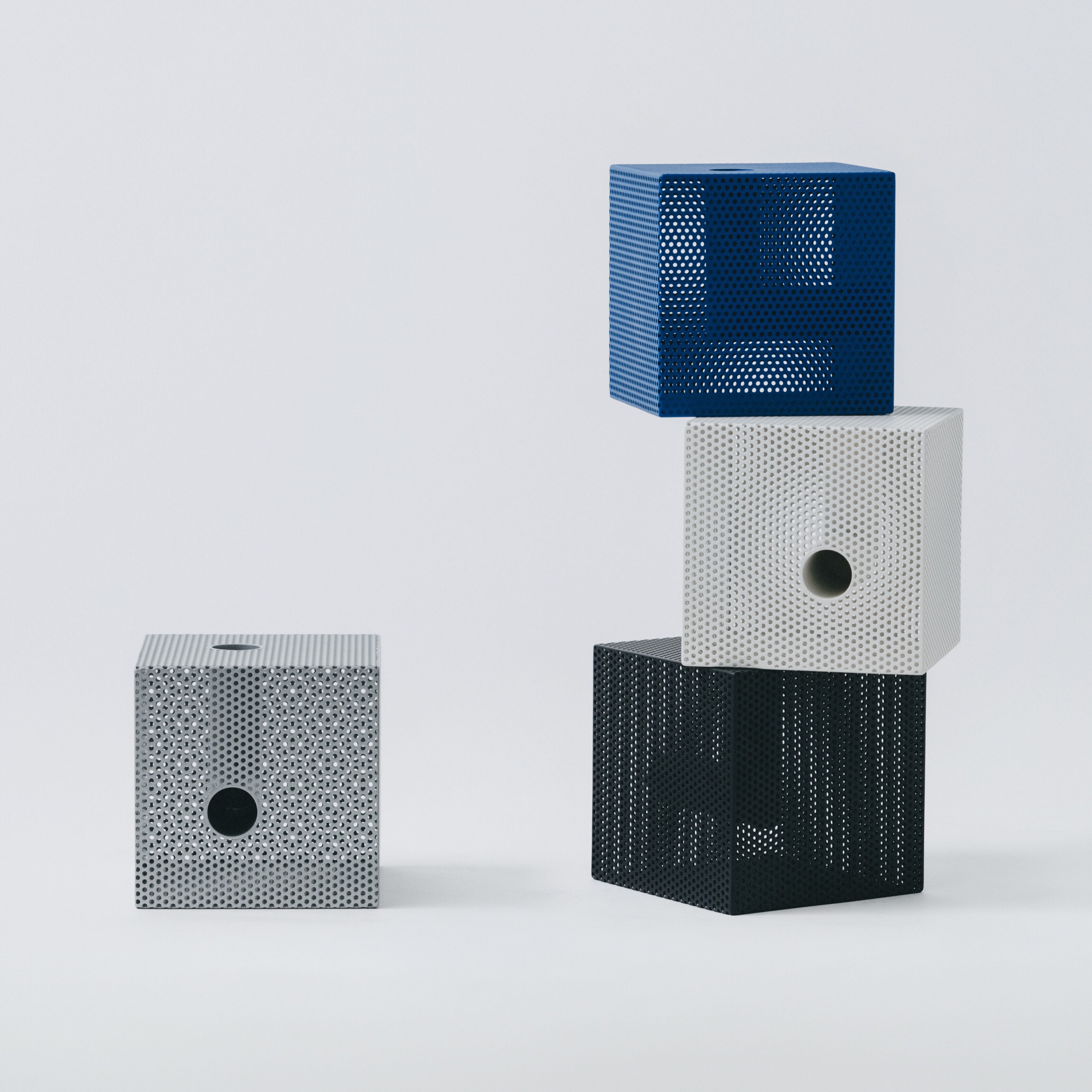 古道具を扱う中で、ものやが大切にしてきたのは「物の価値や意味が一義的に決まらない余白」。Punching Block は、その感覚を工業素材であるパンチングメタルを使って立体として表現したシリーズです。
