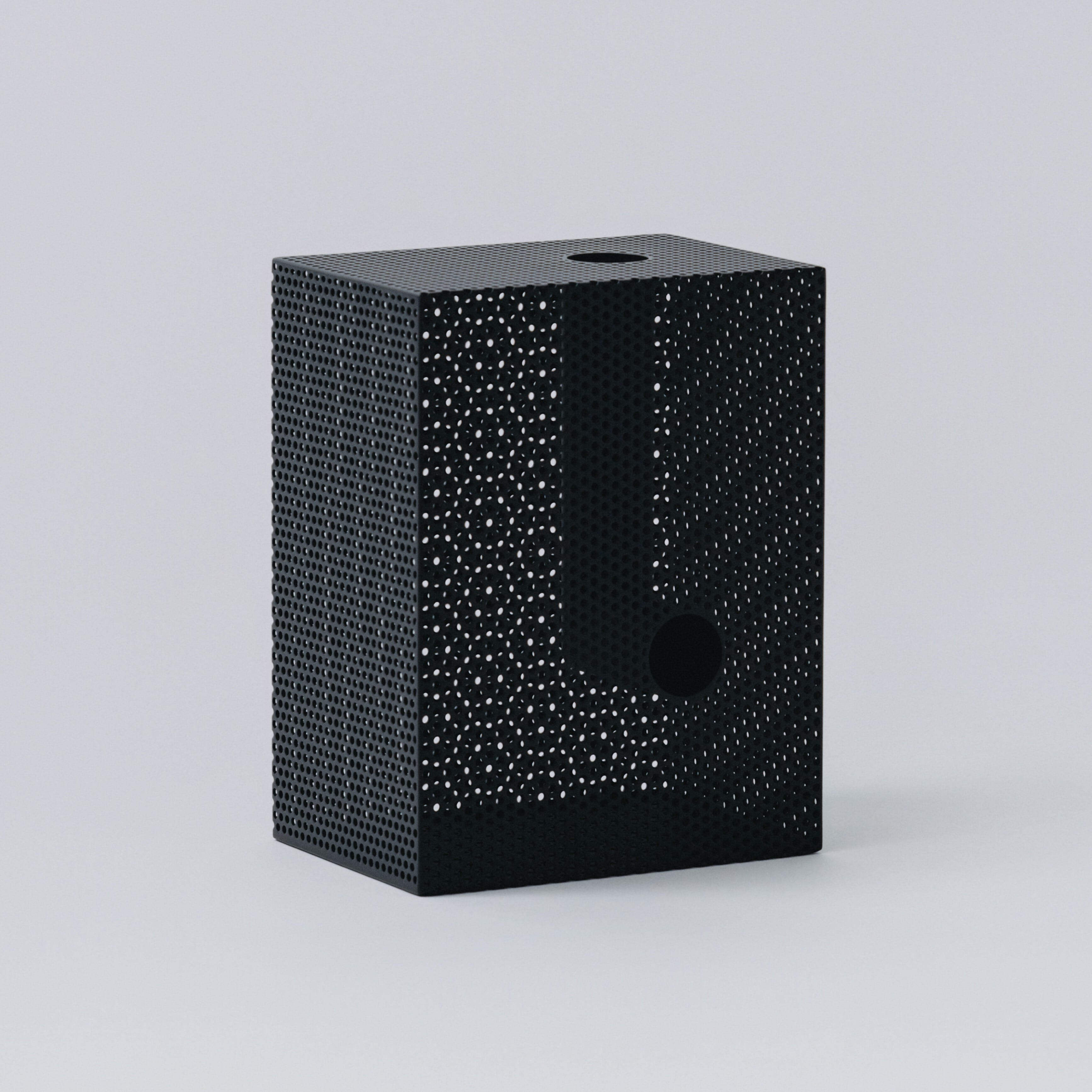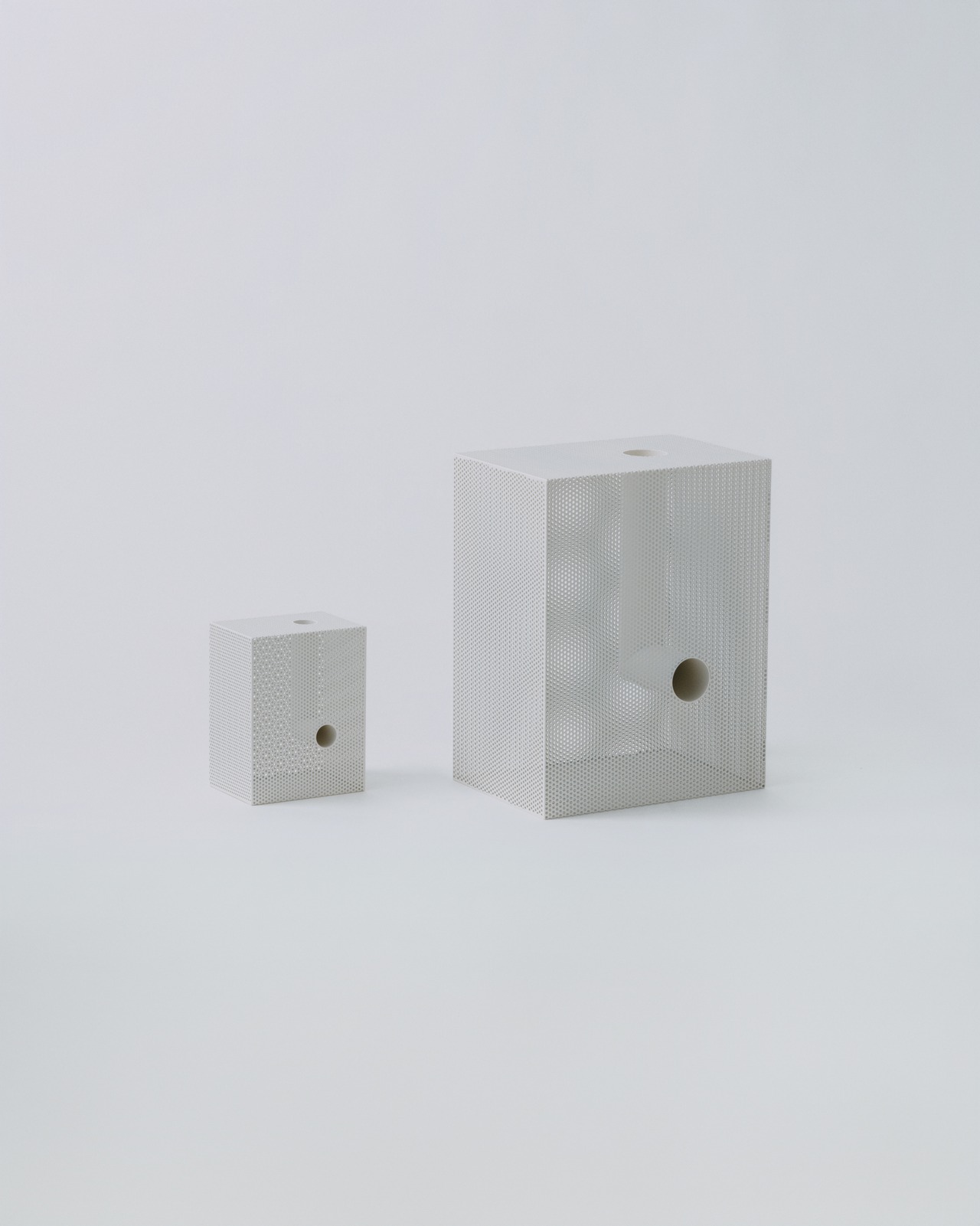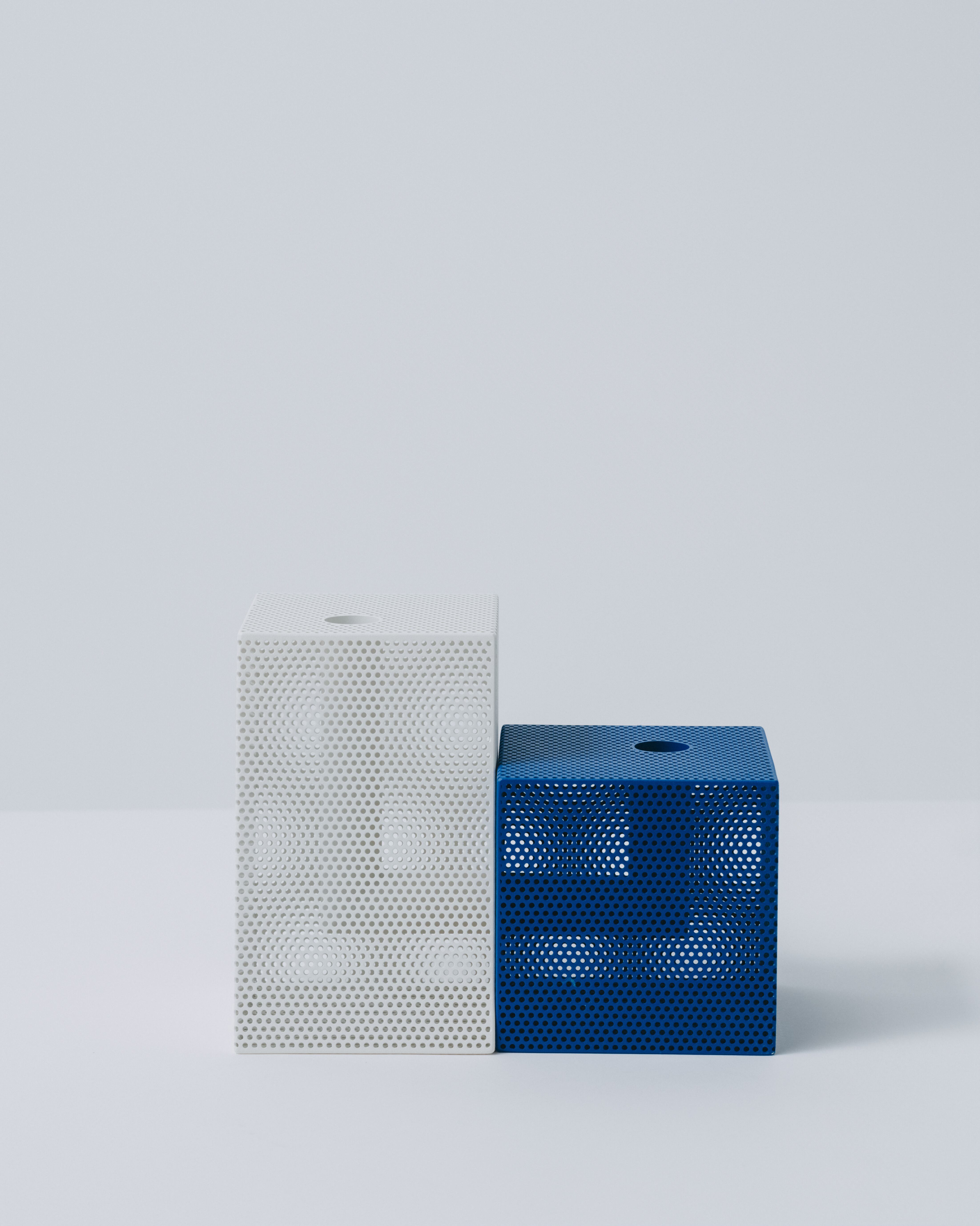 パンチングメタルは、建築・家具・工業製品などで、軽量化・通気性・強度といった機能性を目的に発展してきた素材。しかし、“透けているのに覆っている”、“閉じているようで抜けている” という曖昧な存在感を持ち、光や視点によって印象が大きく変わります。Punching Block は、この“見え方の揺らぎ”そのものに焦点を当てています。
