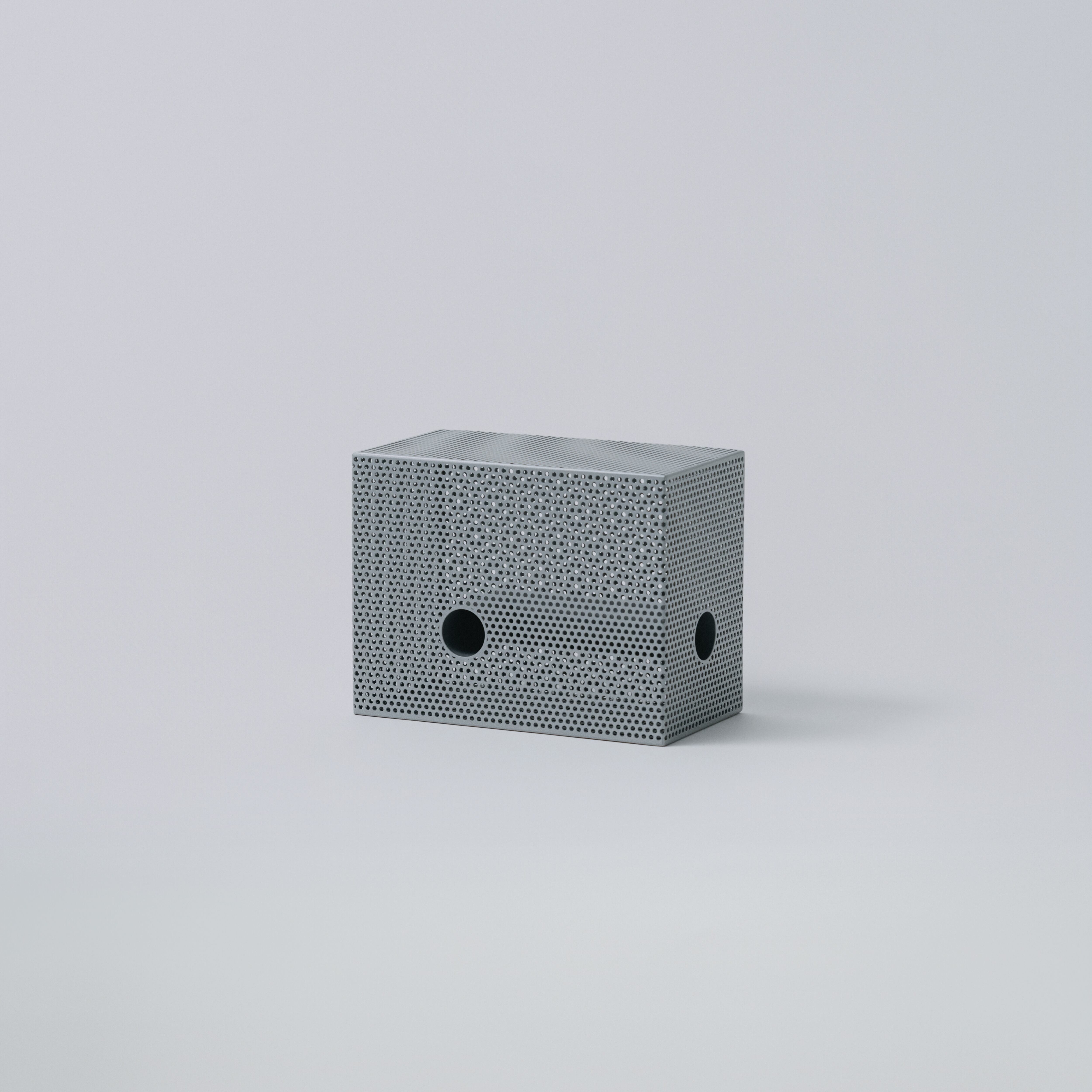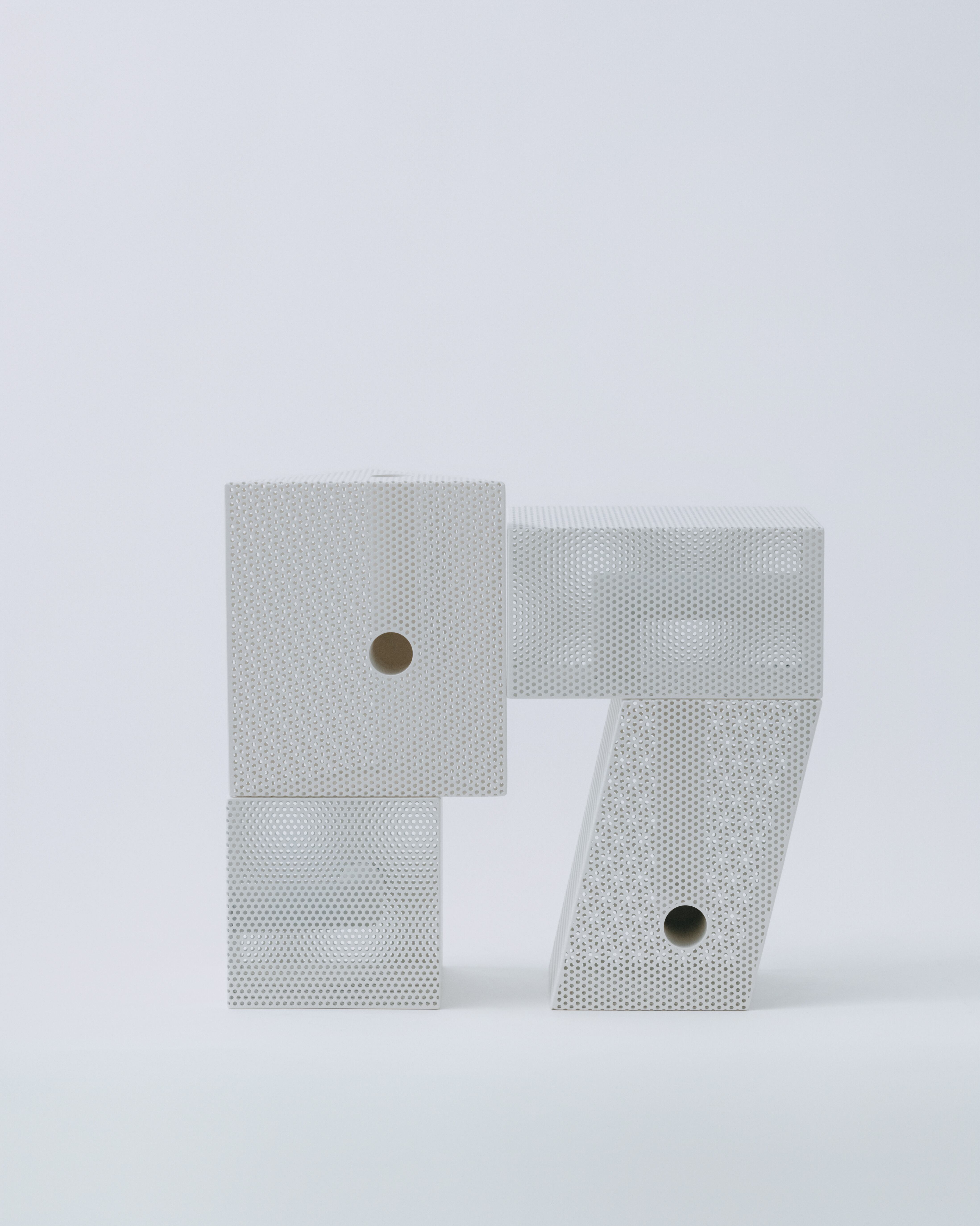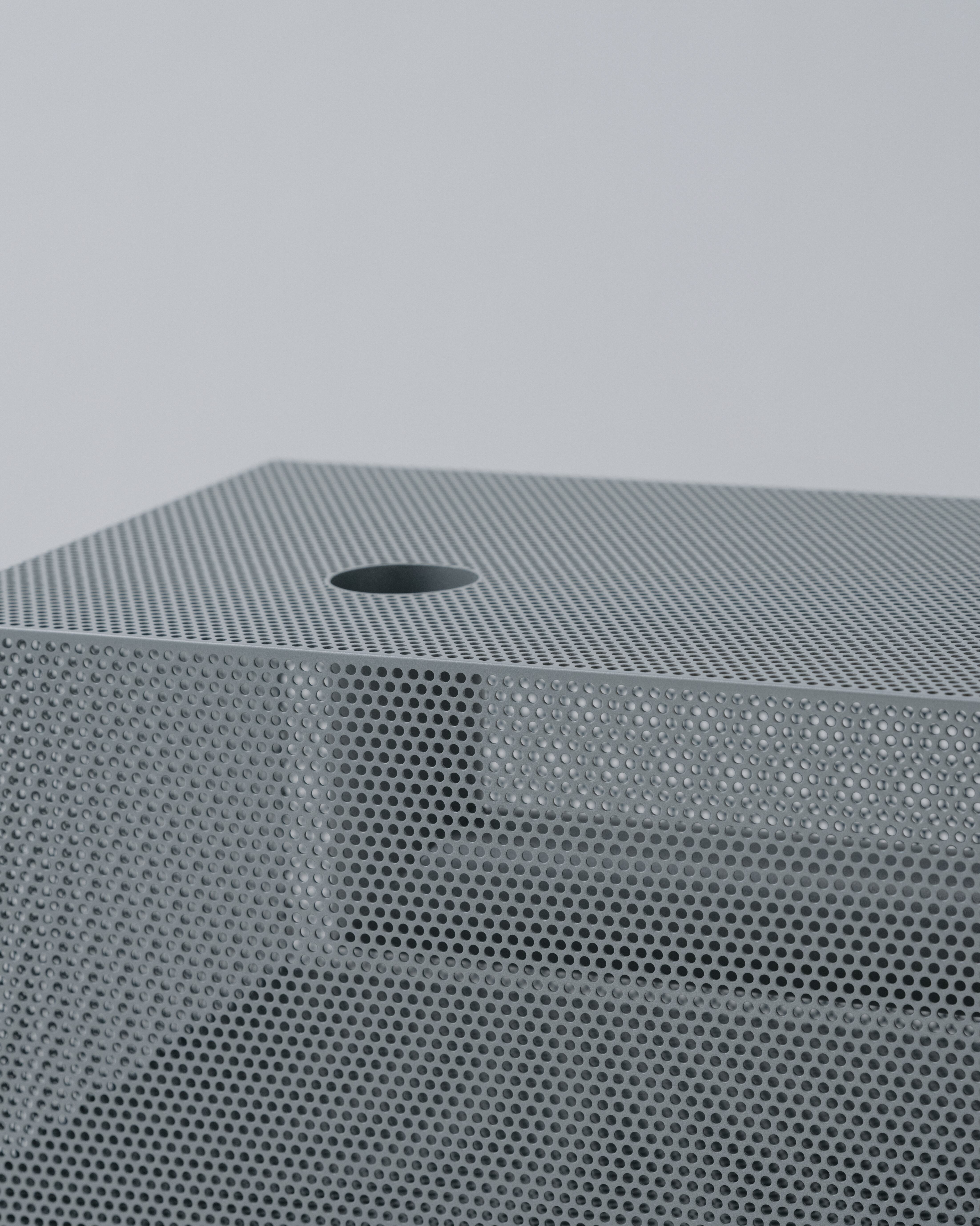 パンチングメタルは、建築・家具・工業製品などで、軽量化・通気性・強度といった機能性を目的に発展してきた素材。しかし、“透けているのに覆っている”、“閉じているようで抜けている” という曖昧な存在感を持ち、光や視点によって印象が大きく変わります。Punching Block は、この“見え方の揺らぎ”そのものに焦点を当てています。