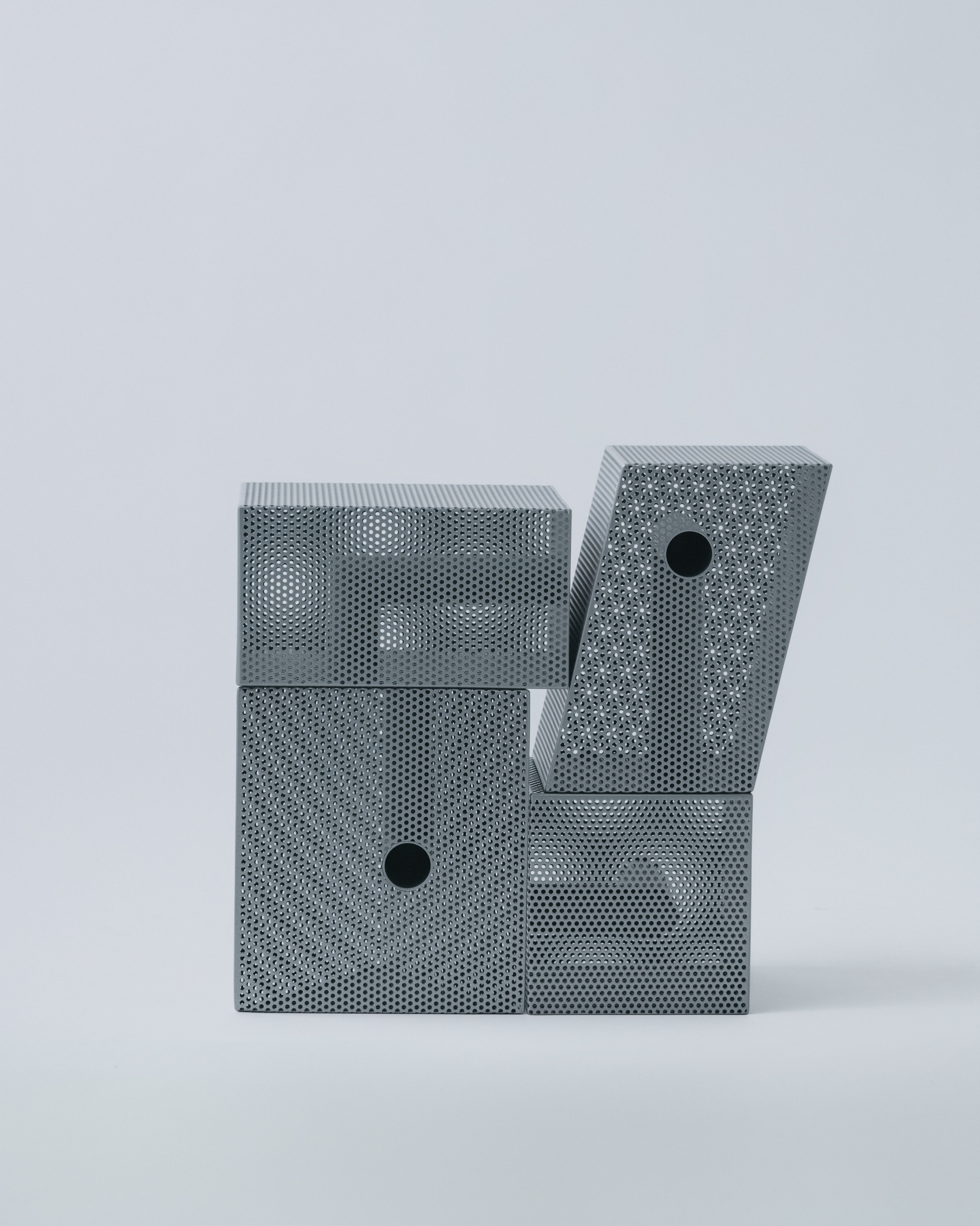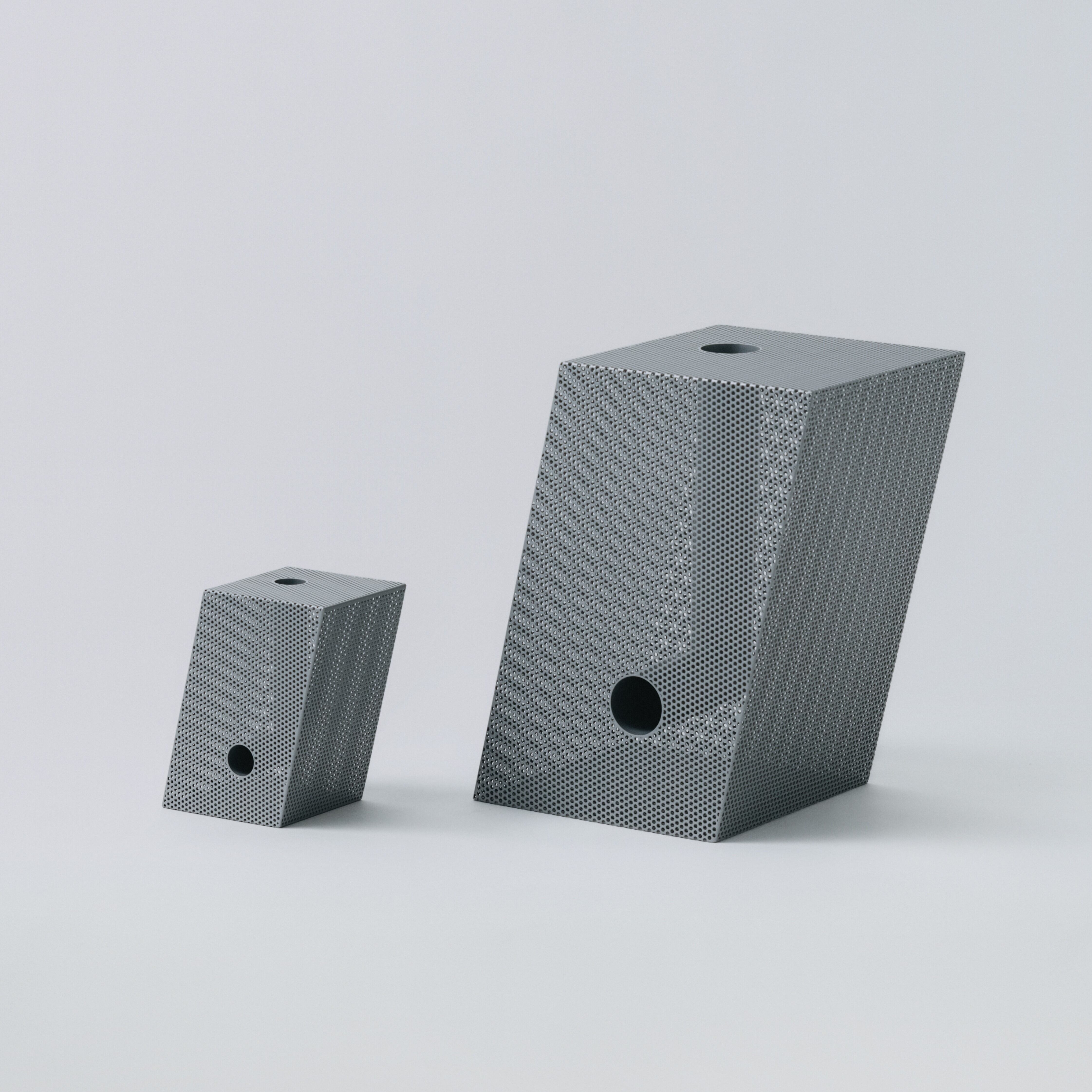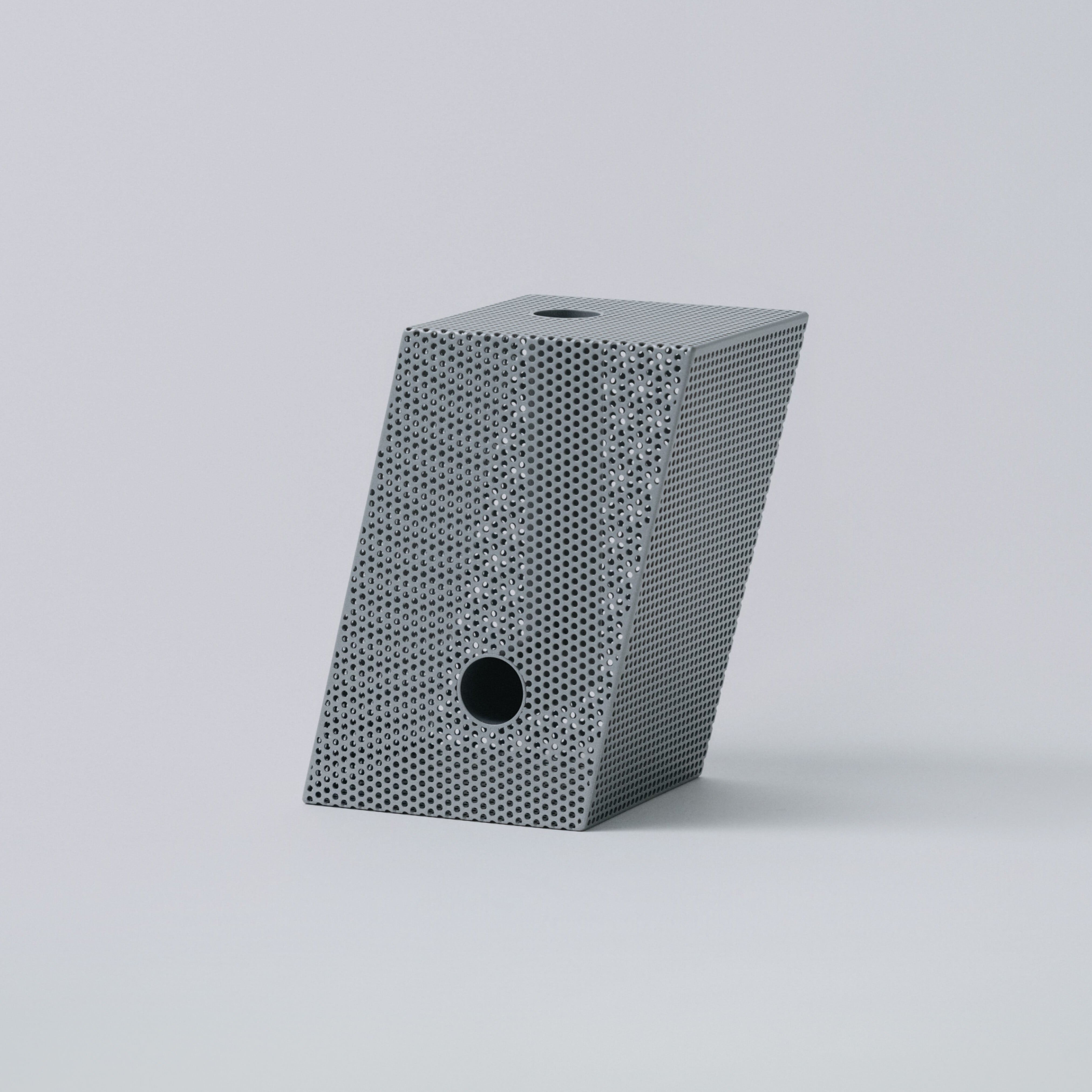パンチングメタルは、建築・家具・工業製品などで、軽量化・通気性・強度といった機能性を目的に発展してきた素材。しかし、“透けているのに覆っている”、“閉じているようで抜けている” という曖昧な存在感を持ち、光や視点によって印象が大きく変わります。Punching Block は、この“見え方の揺らぎ”そのものに焦点を当てています。