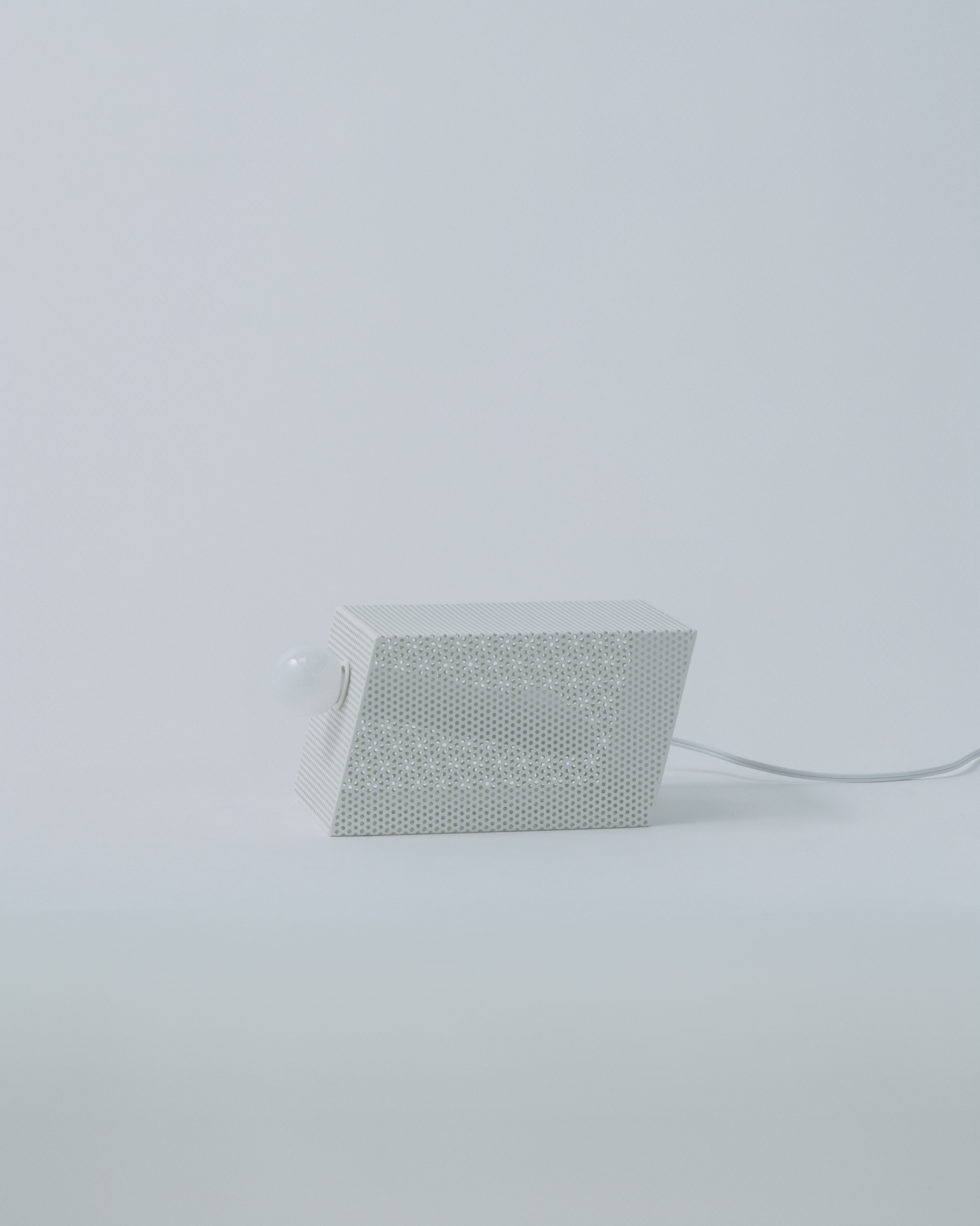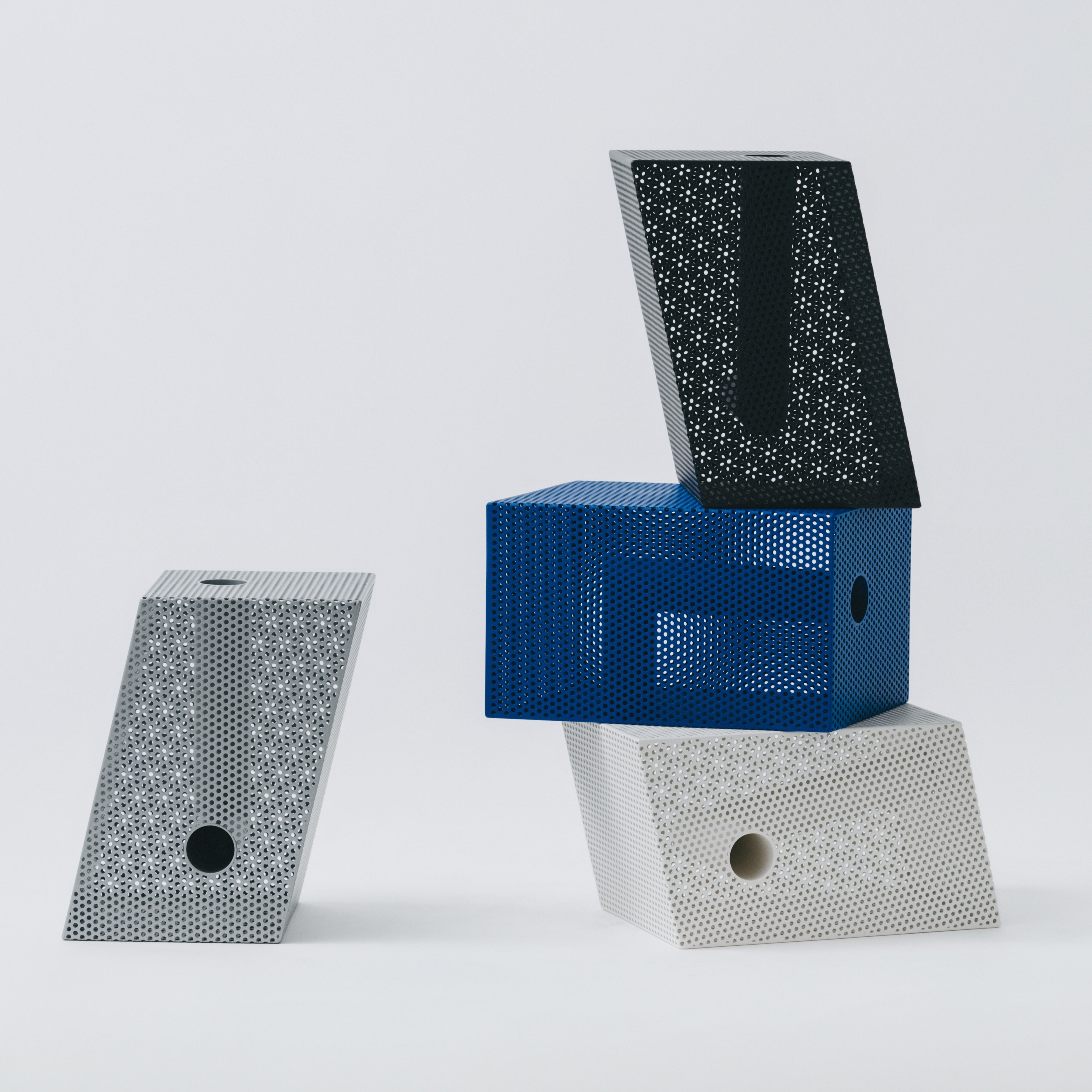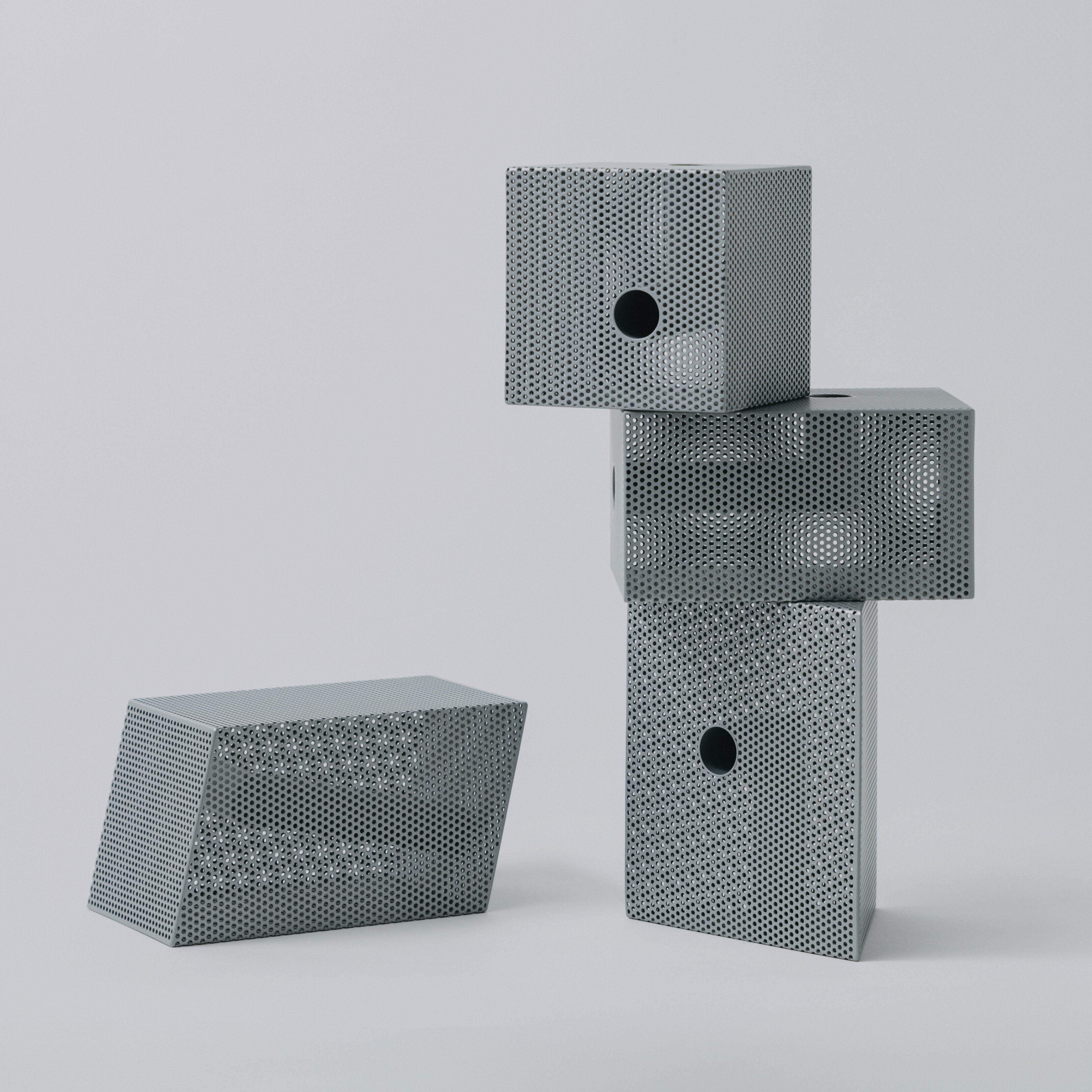 パンチングメタルは、建築・家具・工業製品などで、軽量化・通気性・強度といった機能性を目的に発展してきた素材。しかし、“透けているのに覆っている”、“閉じているようで抜けている” という曖昧な存在感を持ち、光や視点によって印象が大きく変わります。Punching Block は、この“見え方の揺らぎ”そのものに焦点を当てています。