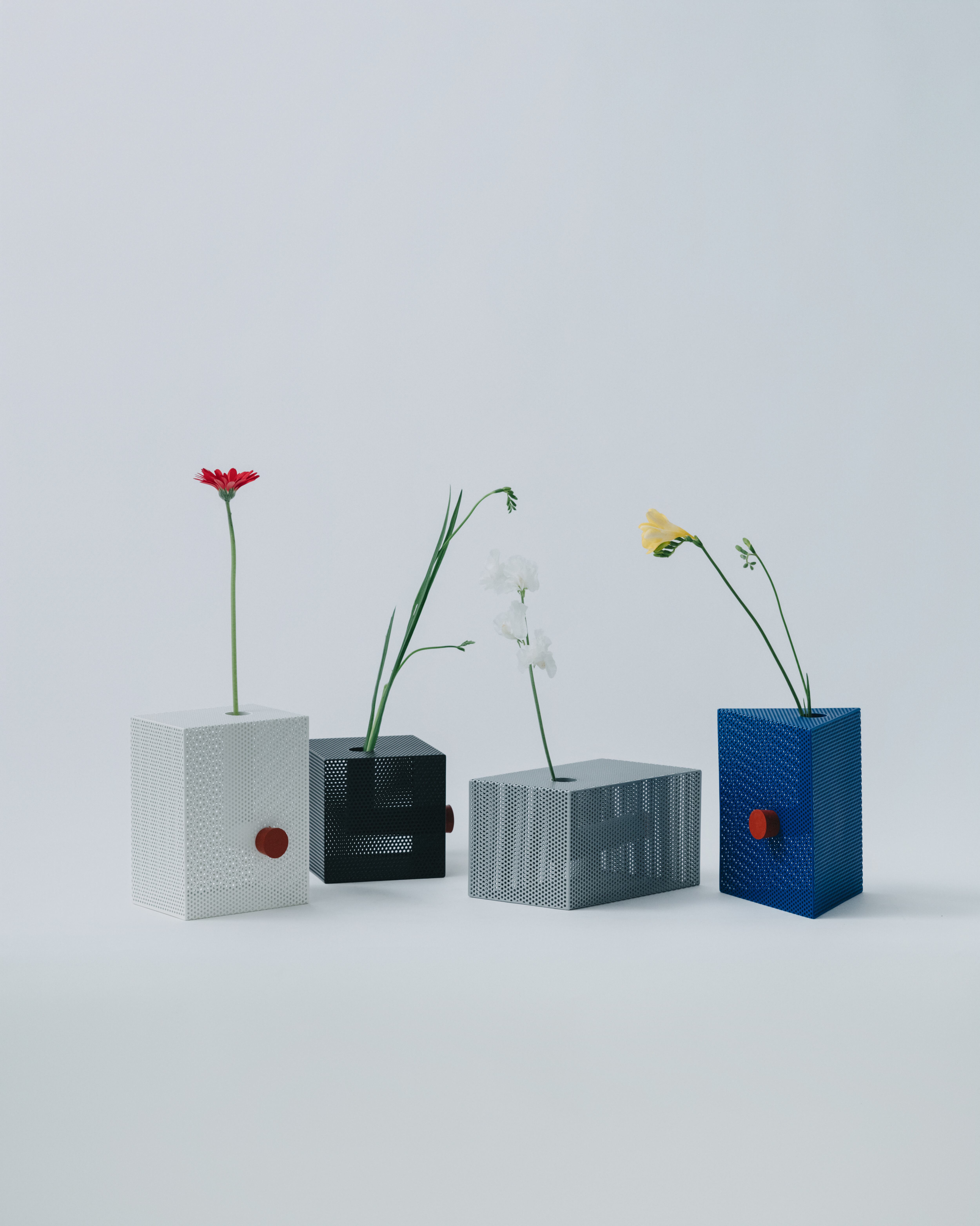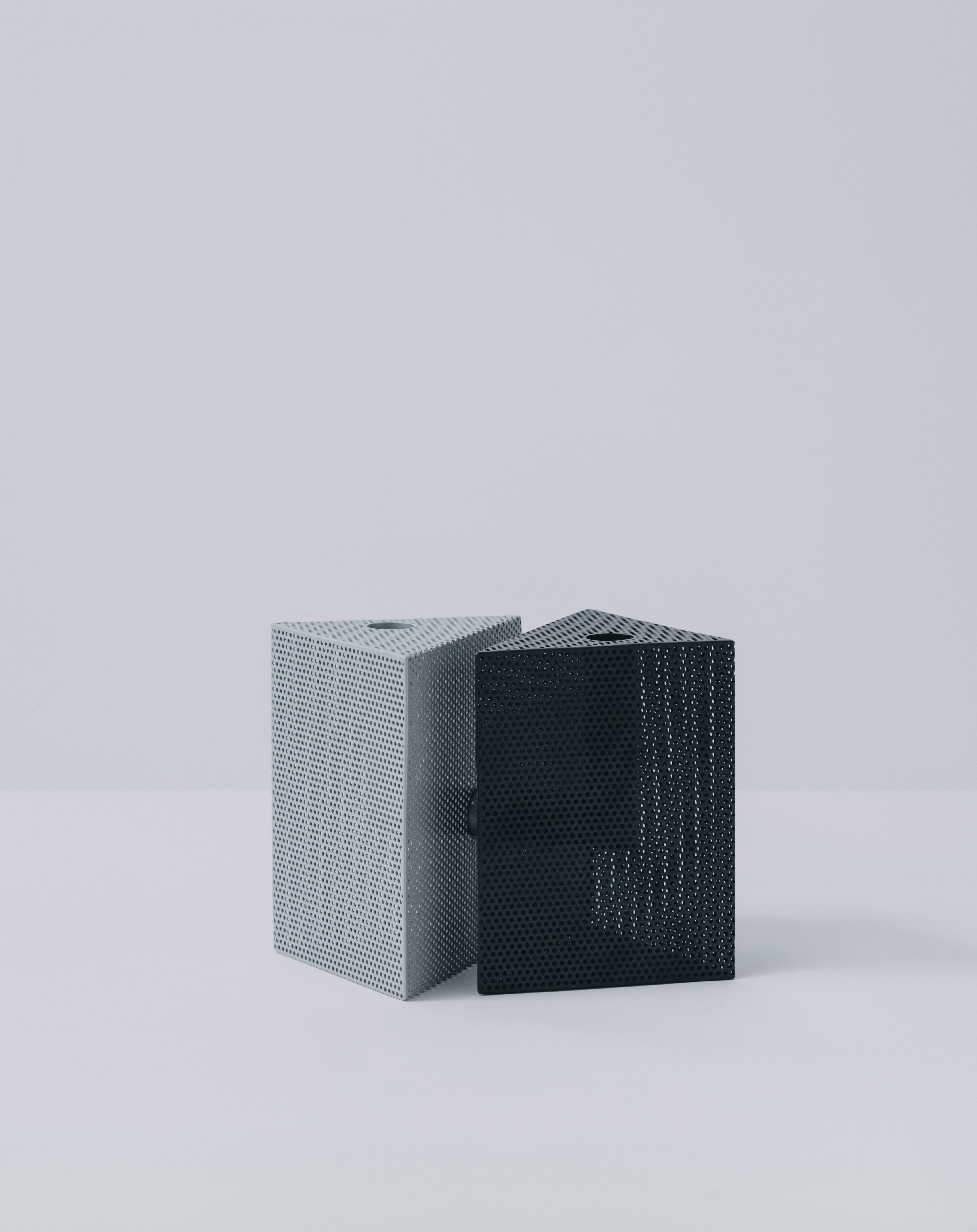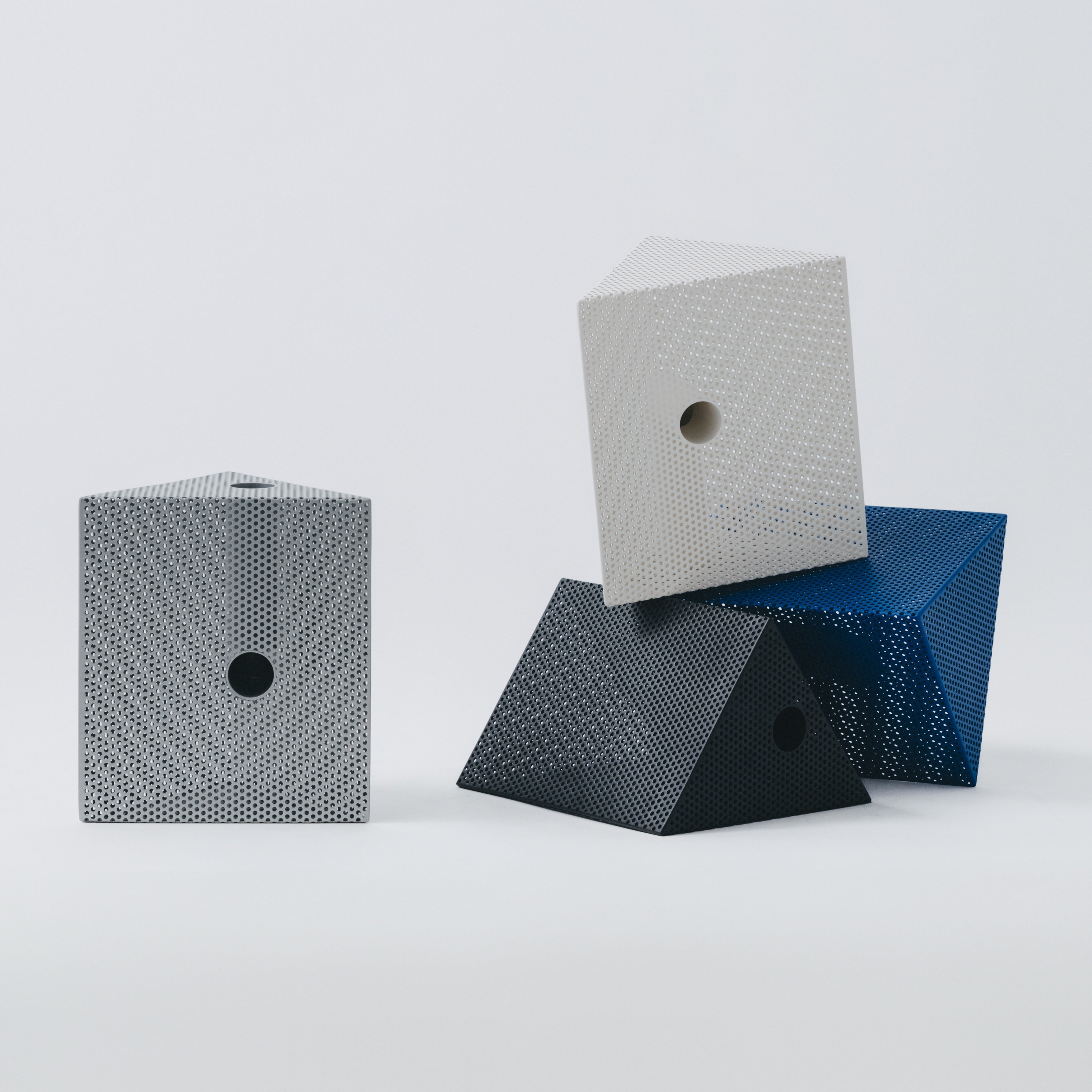 古道具を扱う中で、ものやが大切にしてきたのは「物の価値や意味が一義的に決まらない余白」。Punching Block は、その感覚を工業素材であるパンチングメタルを使って立体として表現したシリーズです。
