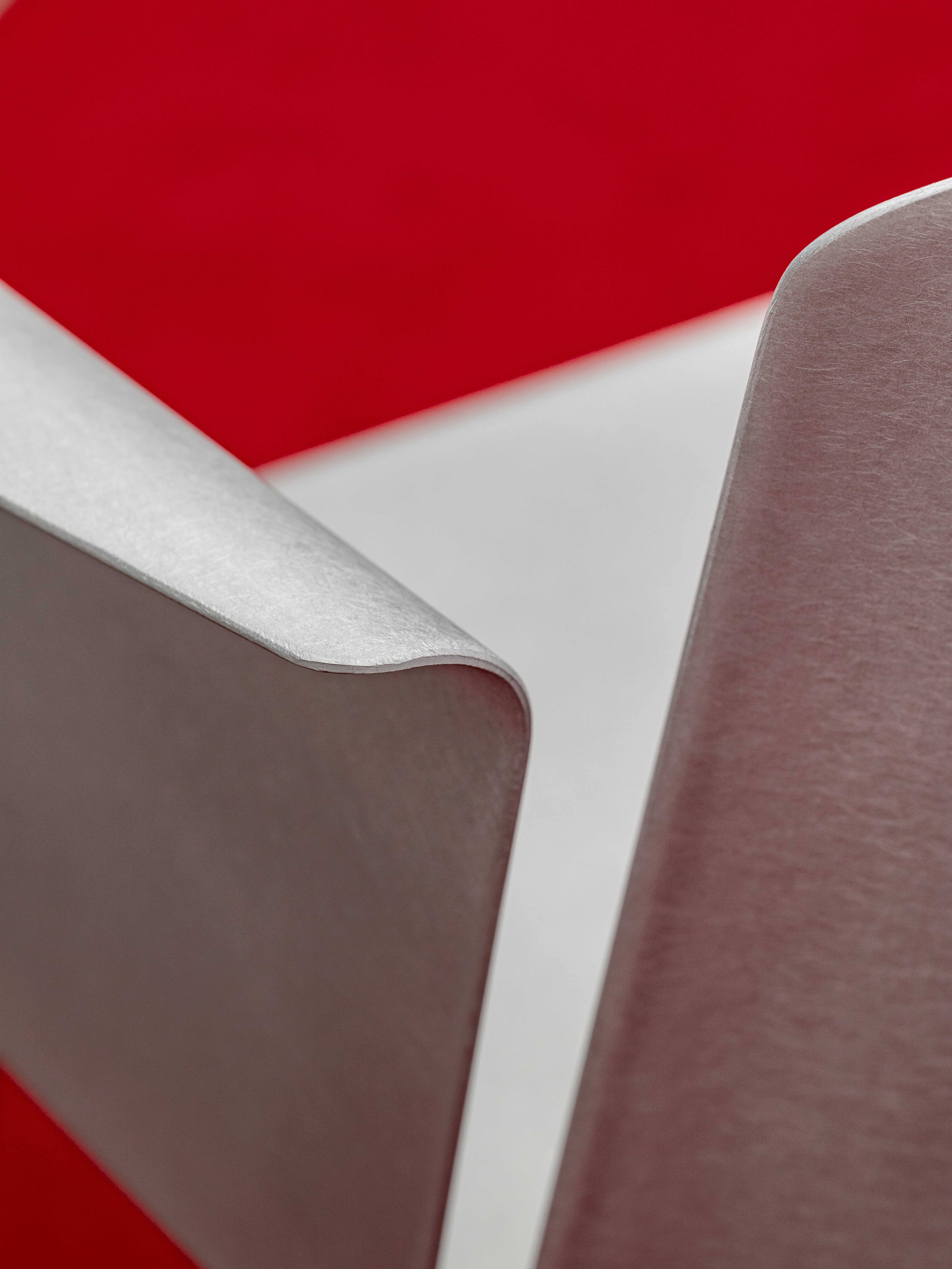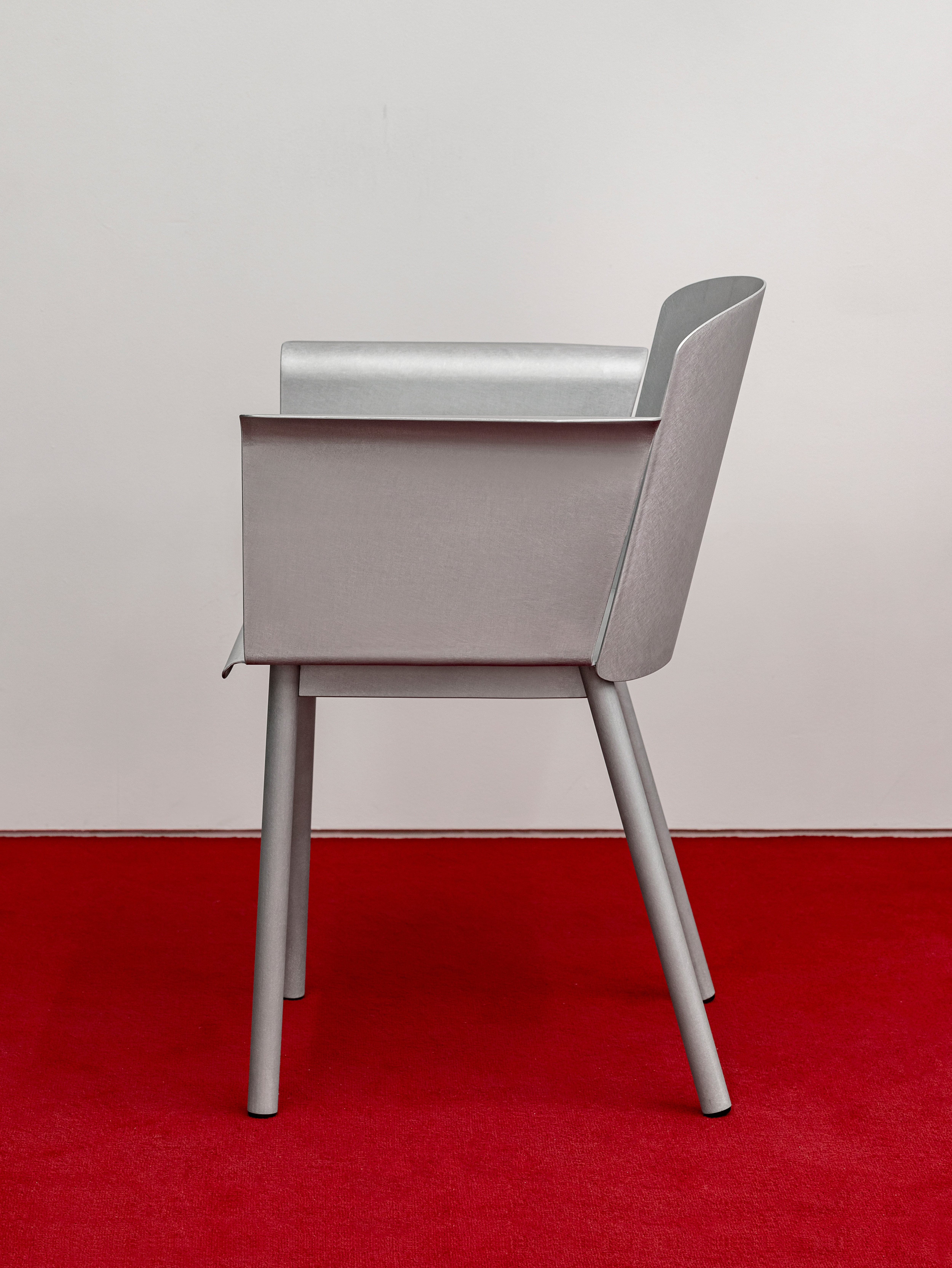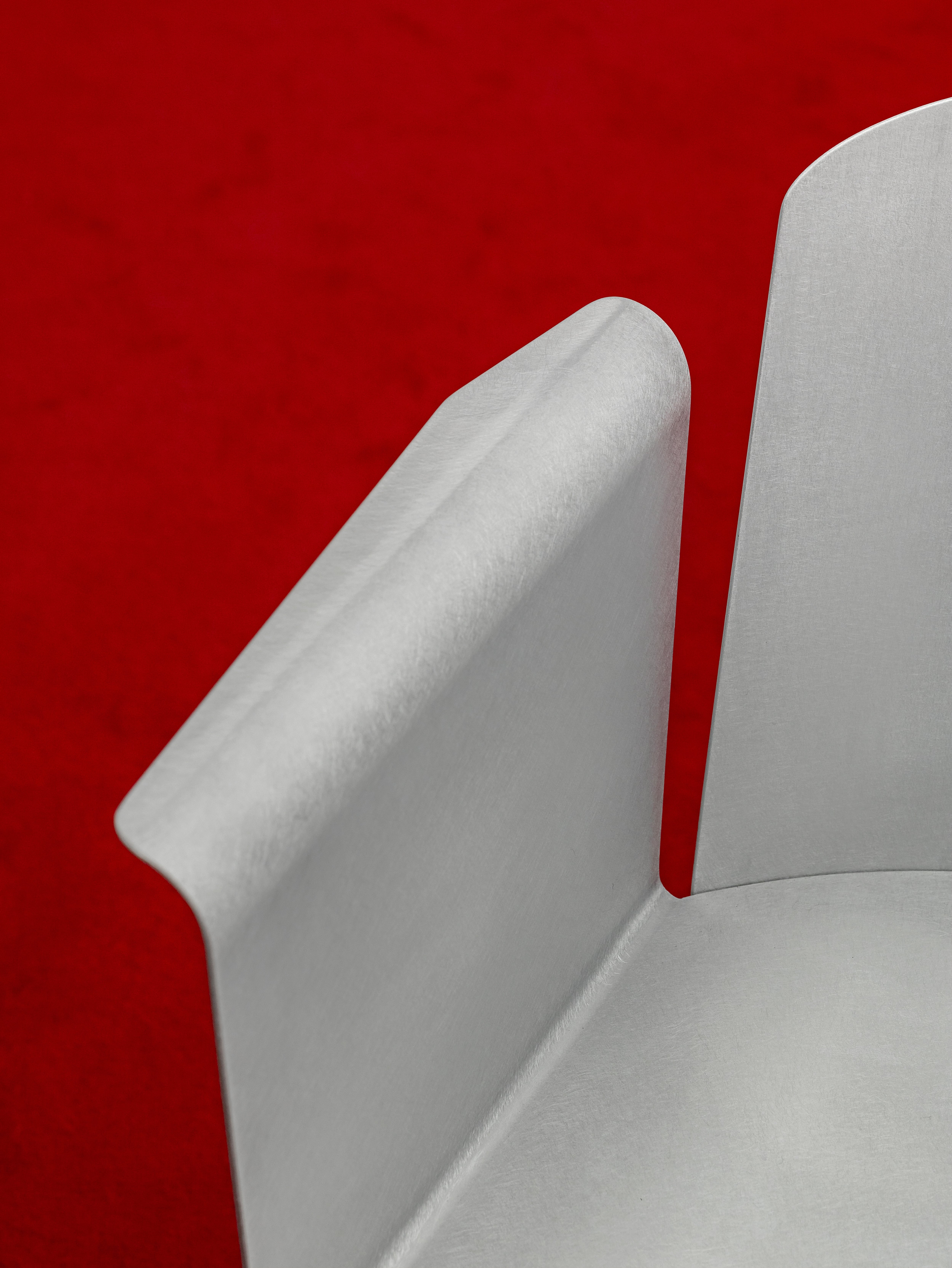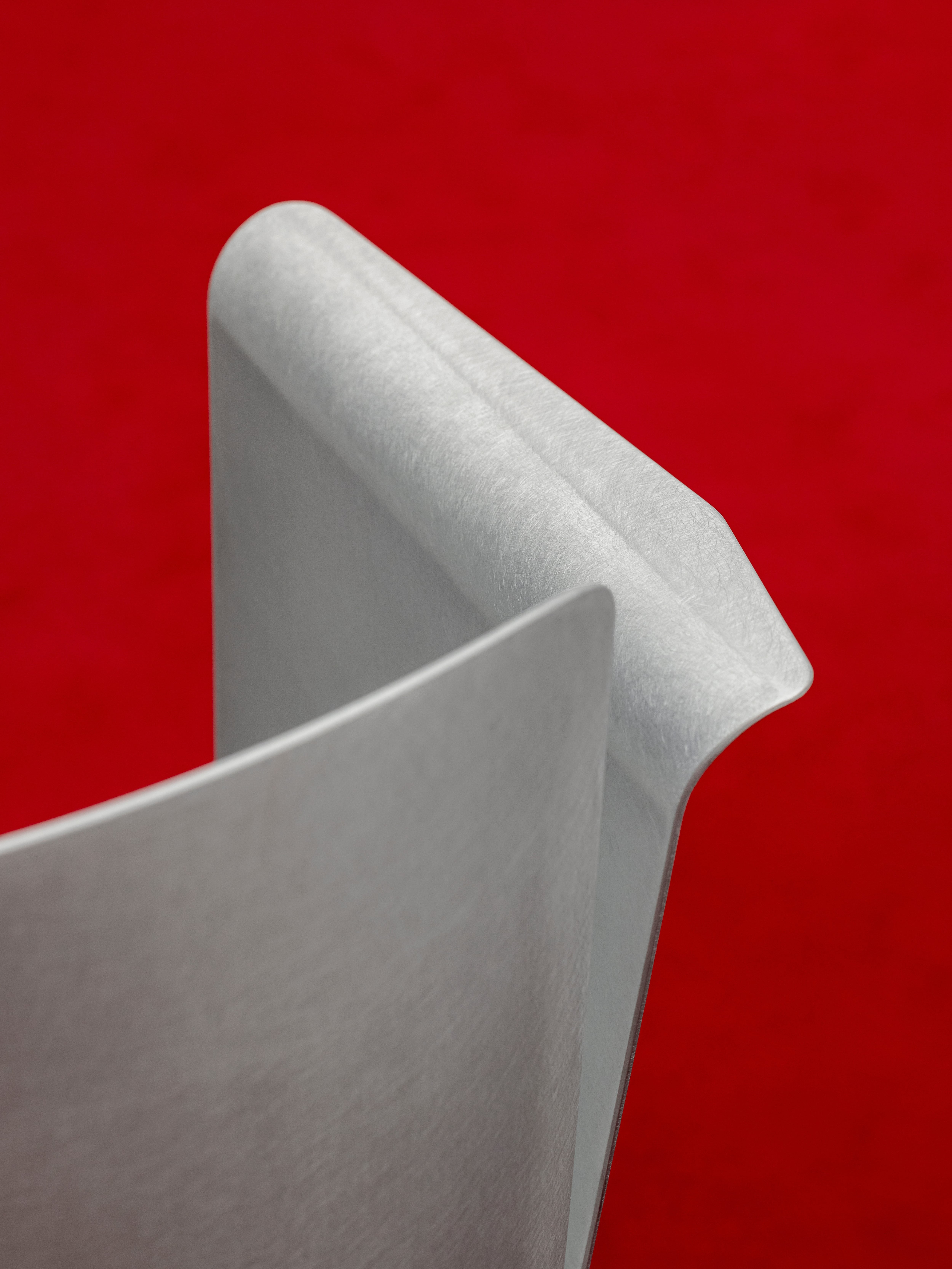 厚みわずか3㎜のアルミニウム板の軽さと柔軟性を活かしつつ、板金特有の鋭さではなく、柔らかな曲線美を採用しています。金属が持つ冷たい印象を払拭し、温かみのある佇まいを目指すことで、素材と技術の融合による新たな家具のあり方を提案しています。