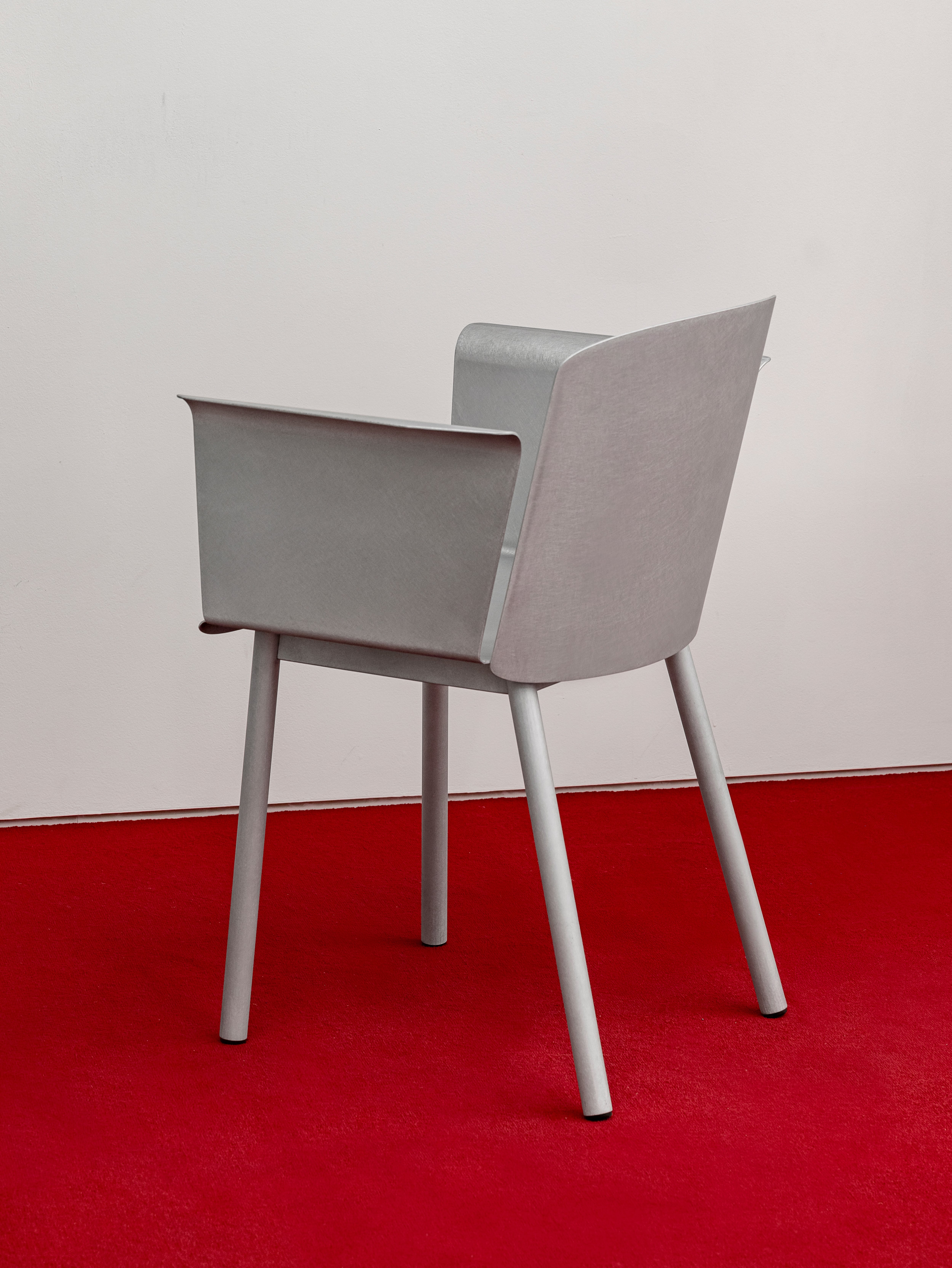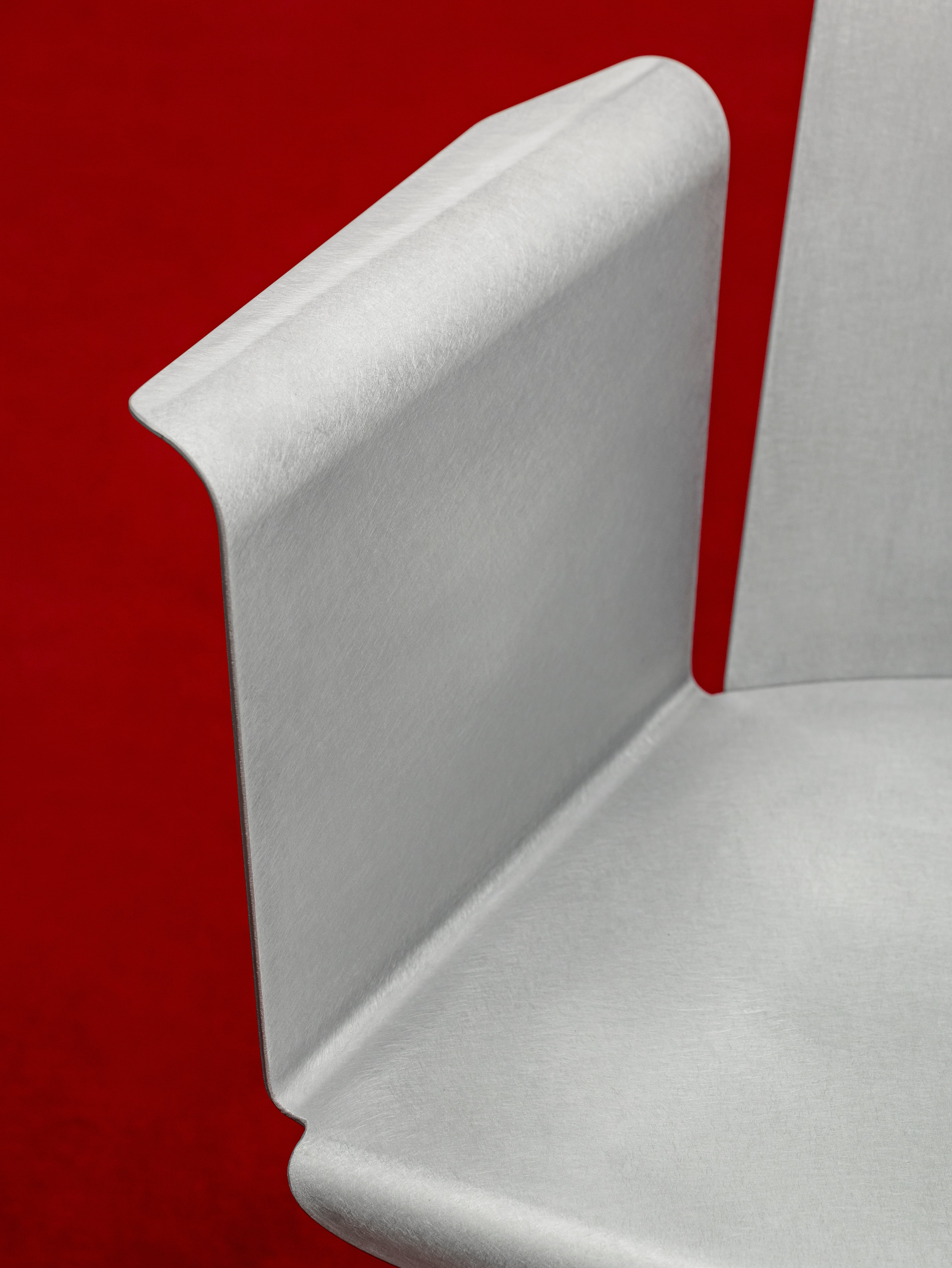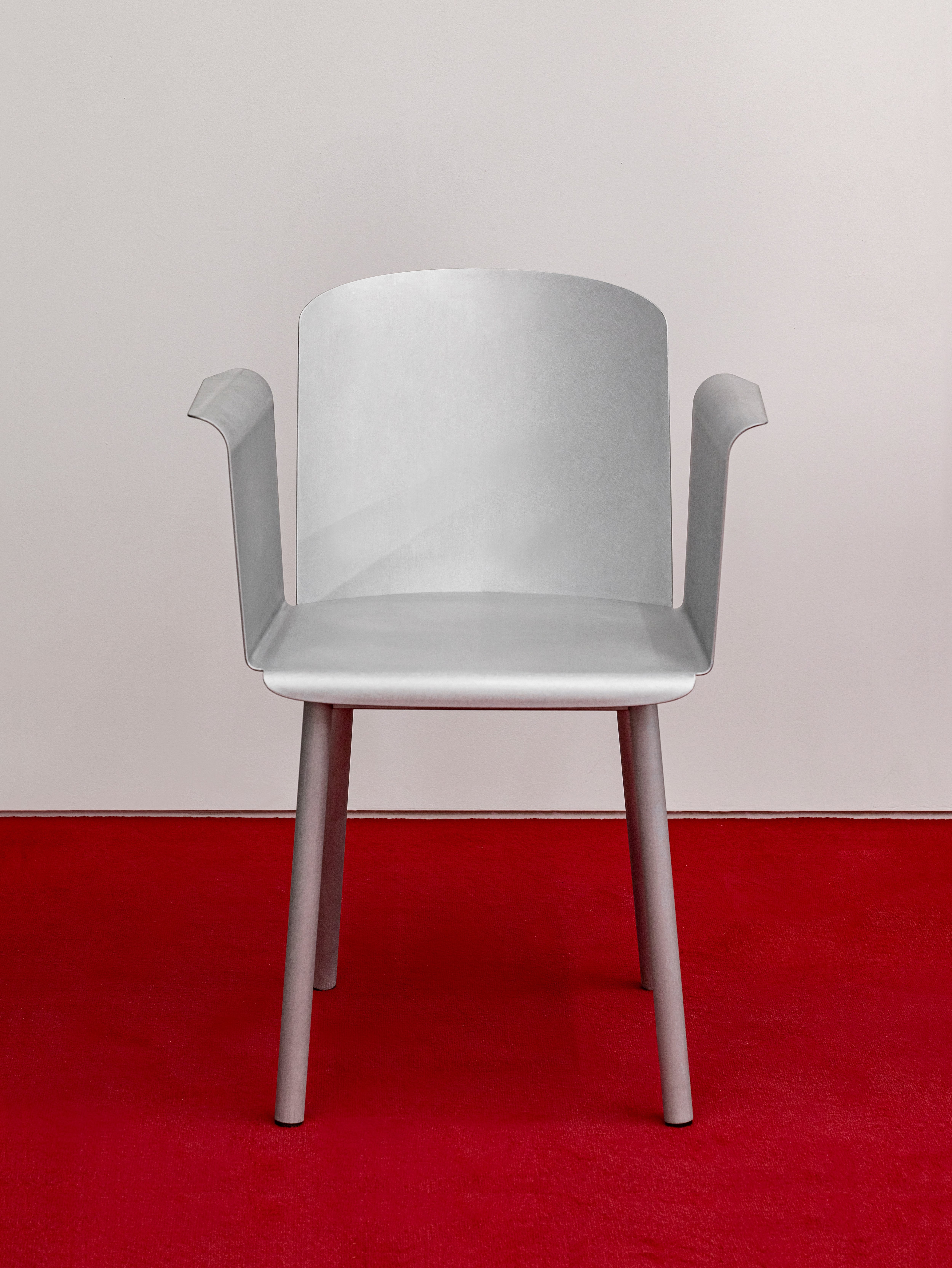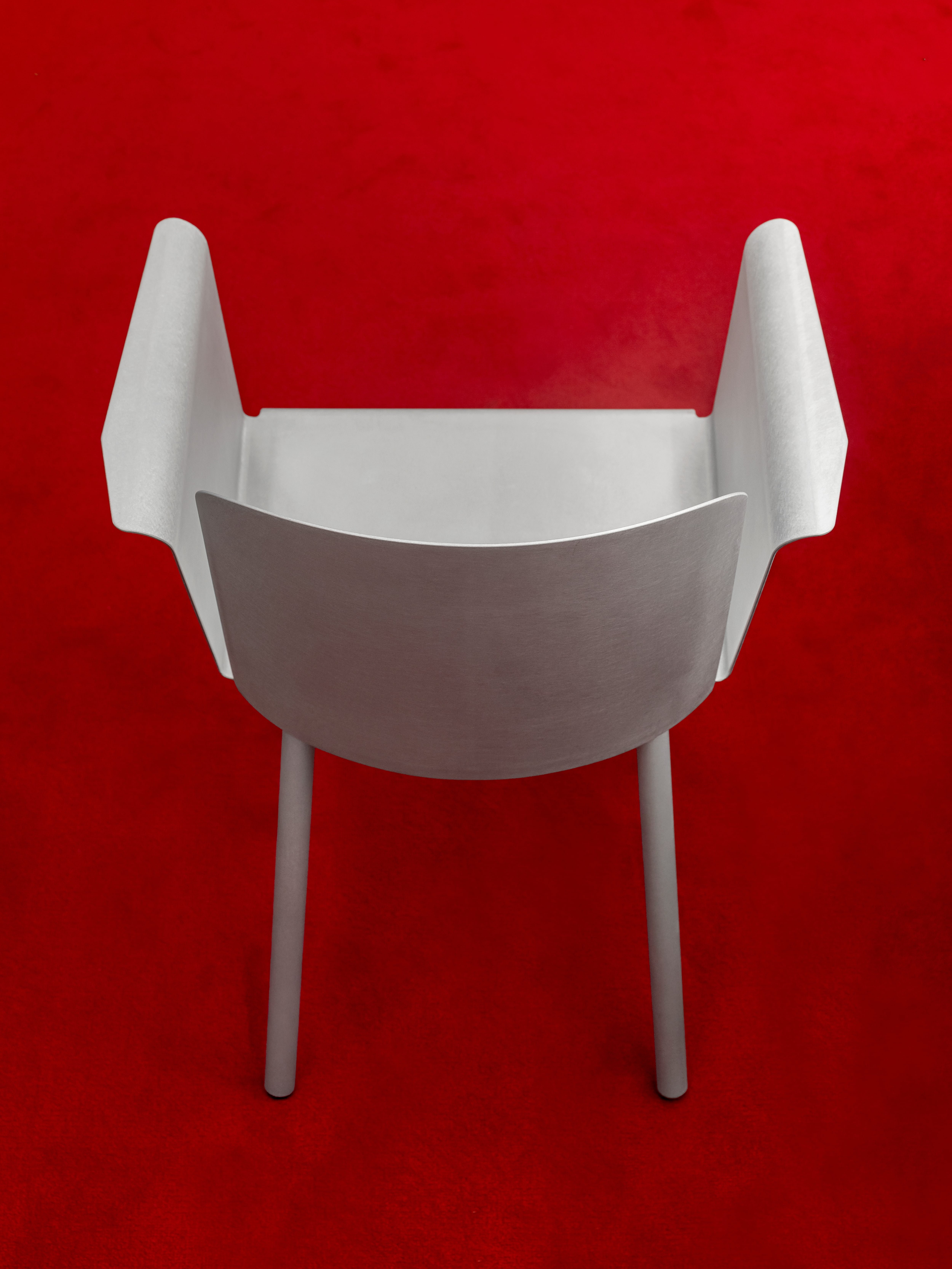 厚みわずか3㎜のアルミニウム板の軽さと柔軟性を活かしつつ、板金特有の鋭さではなく、柔らかな曲線美を採用しています。金属が持つ冷たい印象を払拭し、温かみのある佇まいを目指すことで、素材と技術の融合による新たな家具のあり方を提案しています。